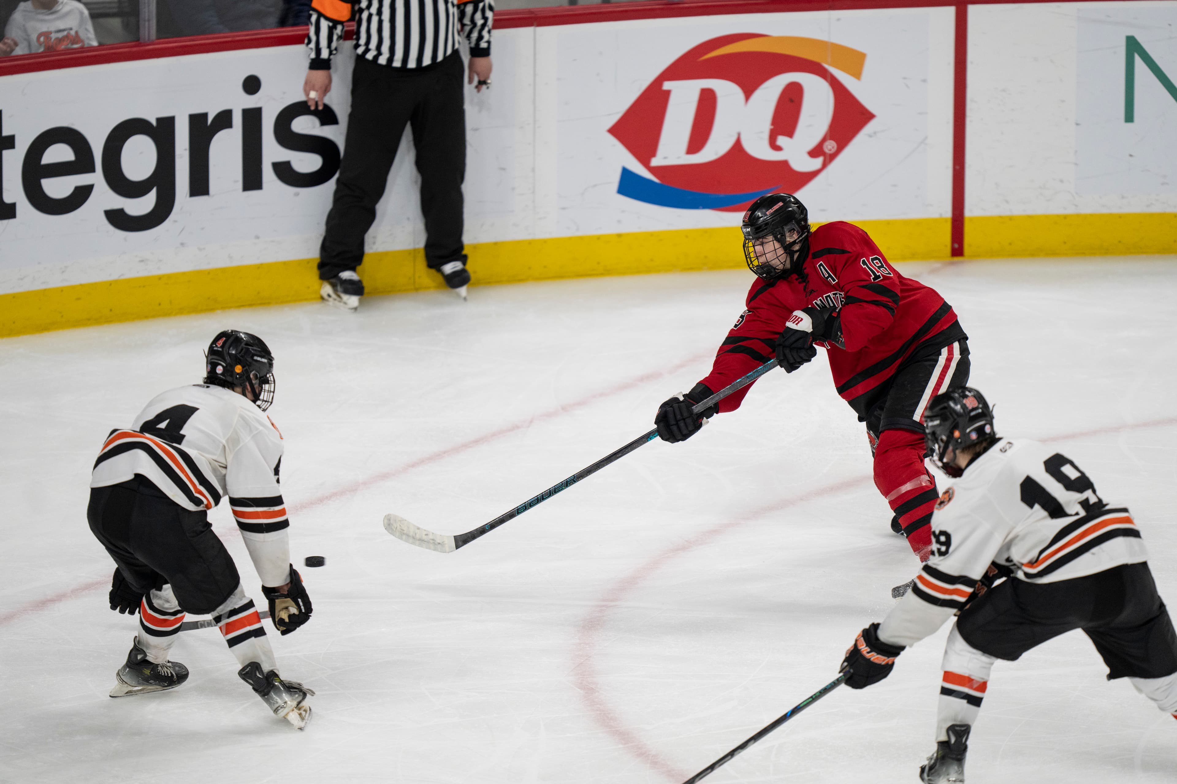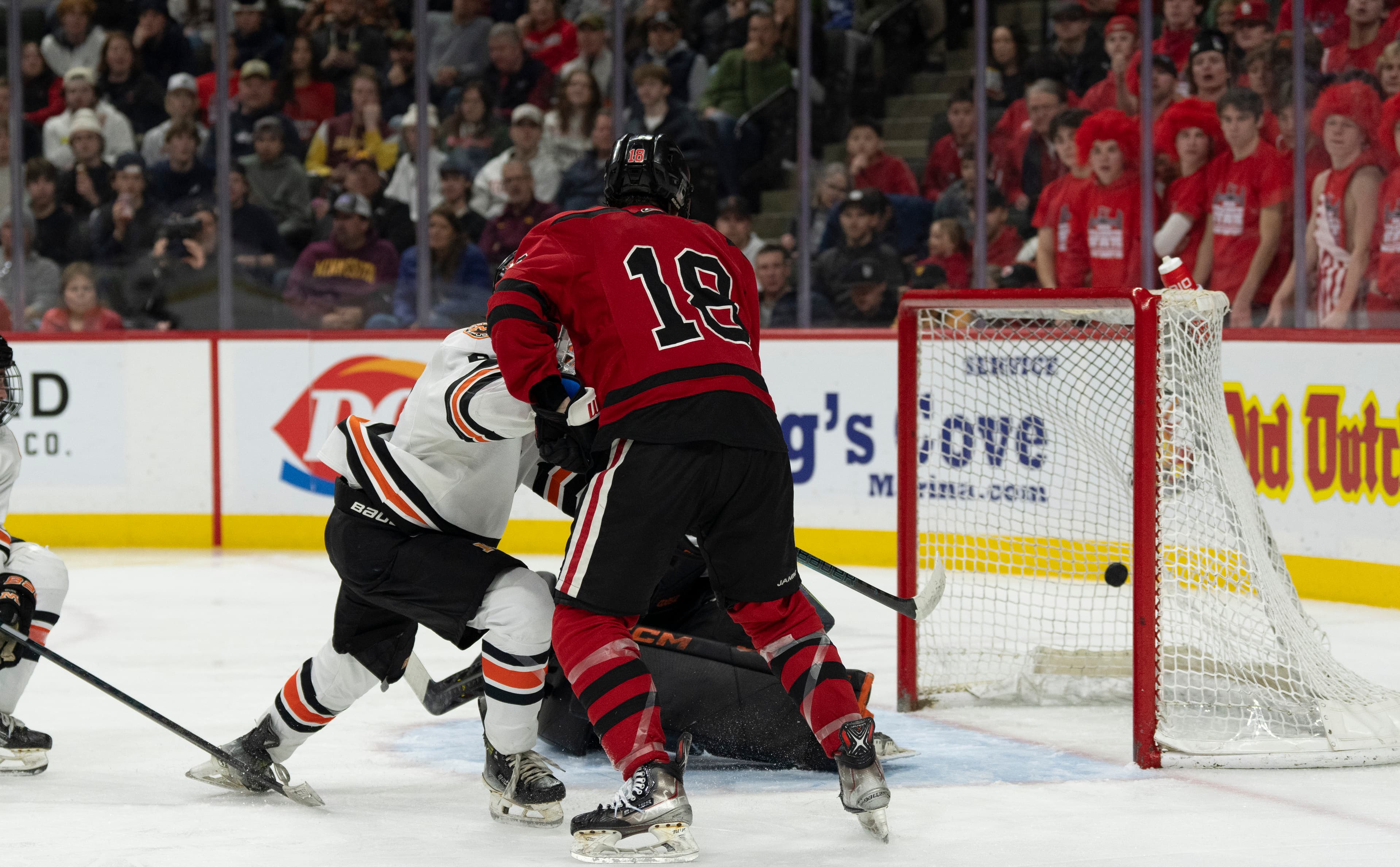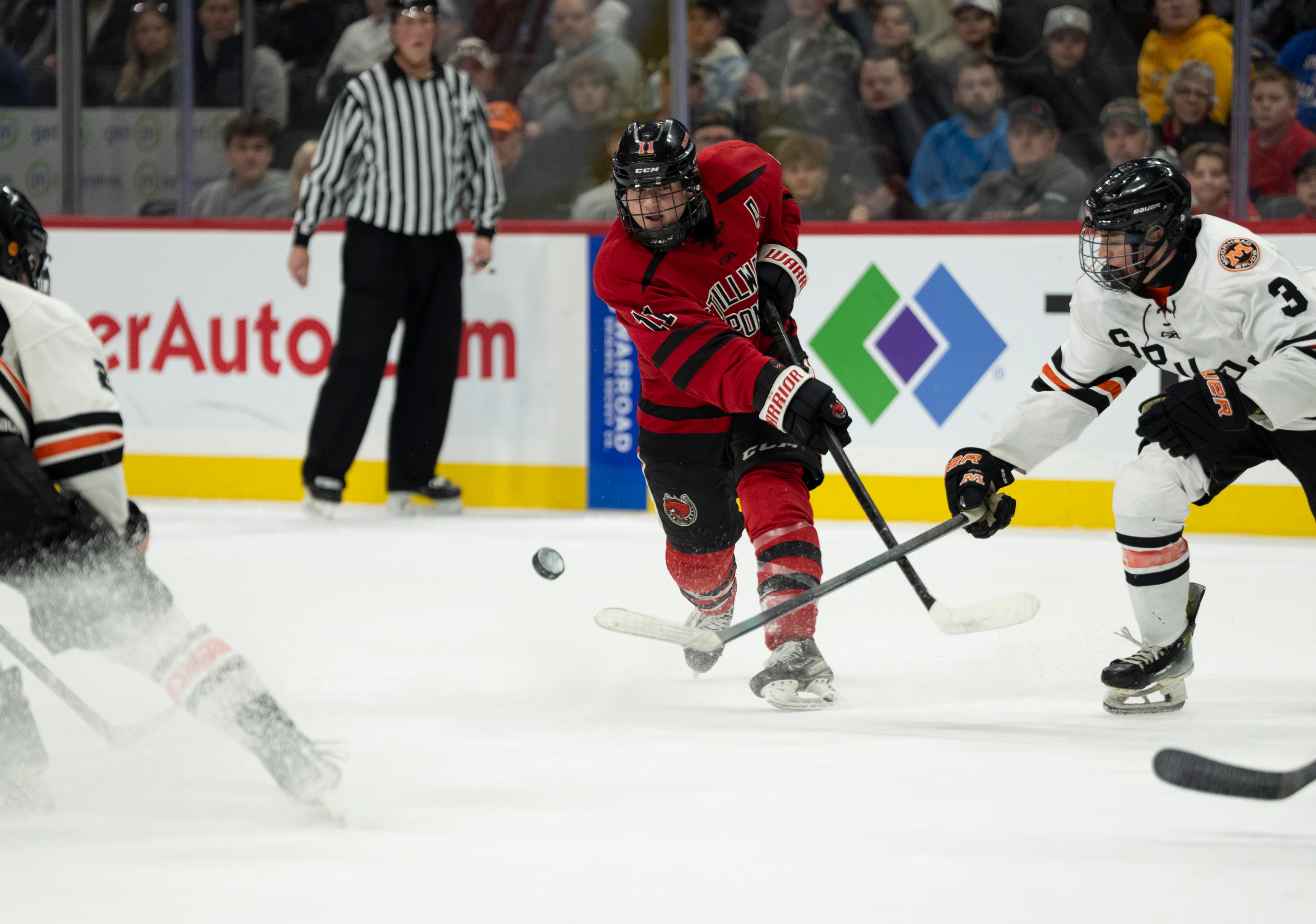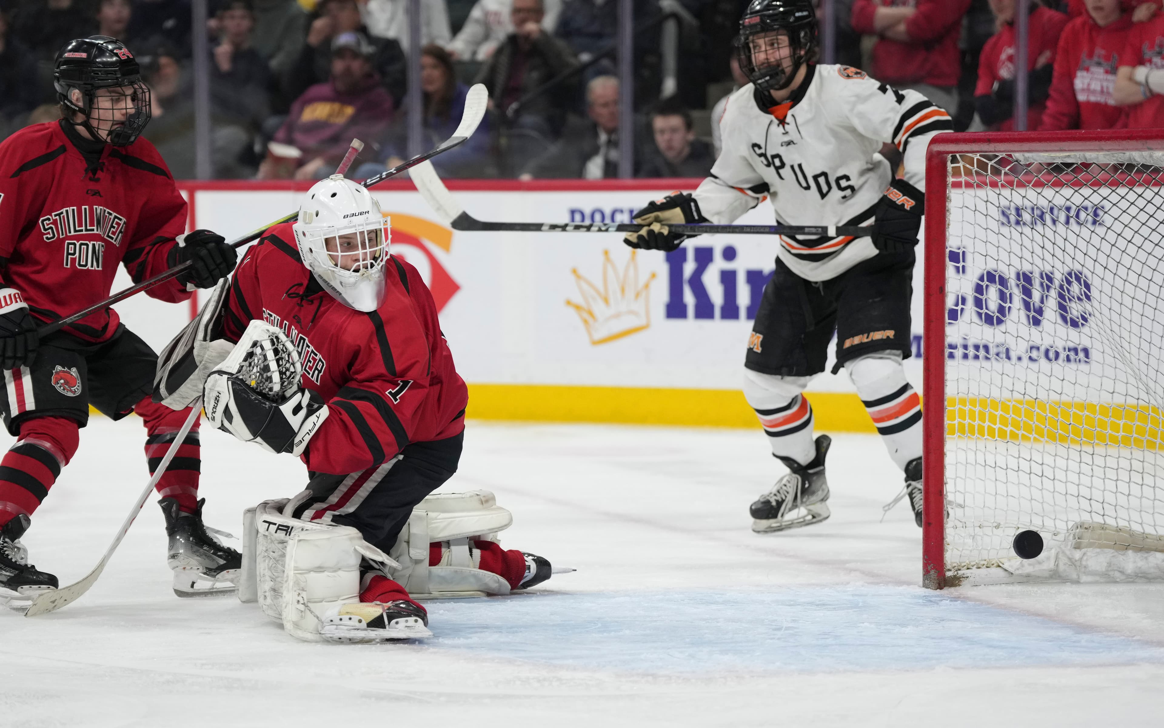 Then, with 2:12 left to play in the first, Stillwater senior Matthew Volkman slung a pass across the slot to sophomore Luca Jarvis, who one-timed it past goalie Charlie Stenehjem for his 23rd goal of the year.