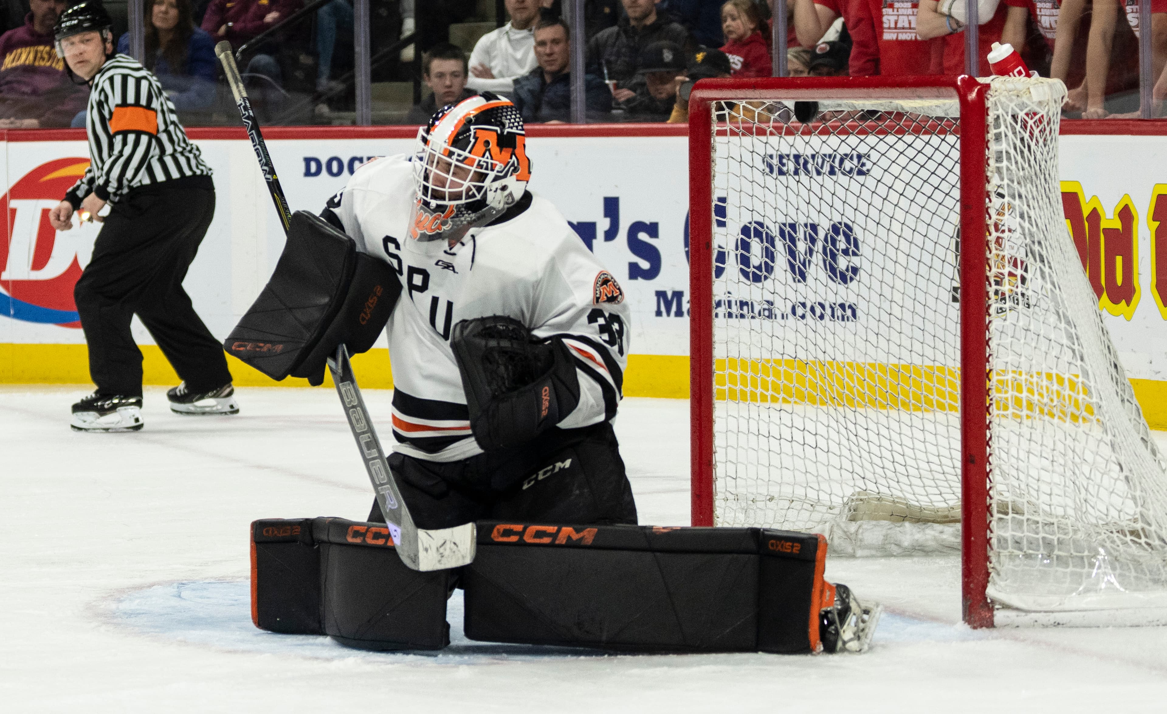 Moorhead’s game plan included a fast start, and what the Spuds got was a deflection off a Stillwater defenseman’s skate for a goal that ended the Ponies goaltender Cal Conway’s shutout streak at 1:22 of the first period.