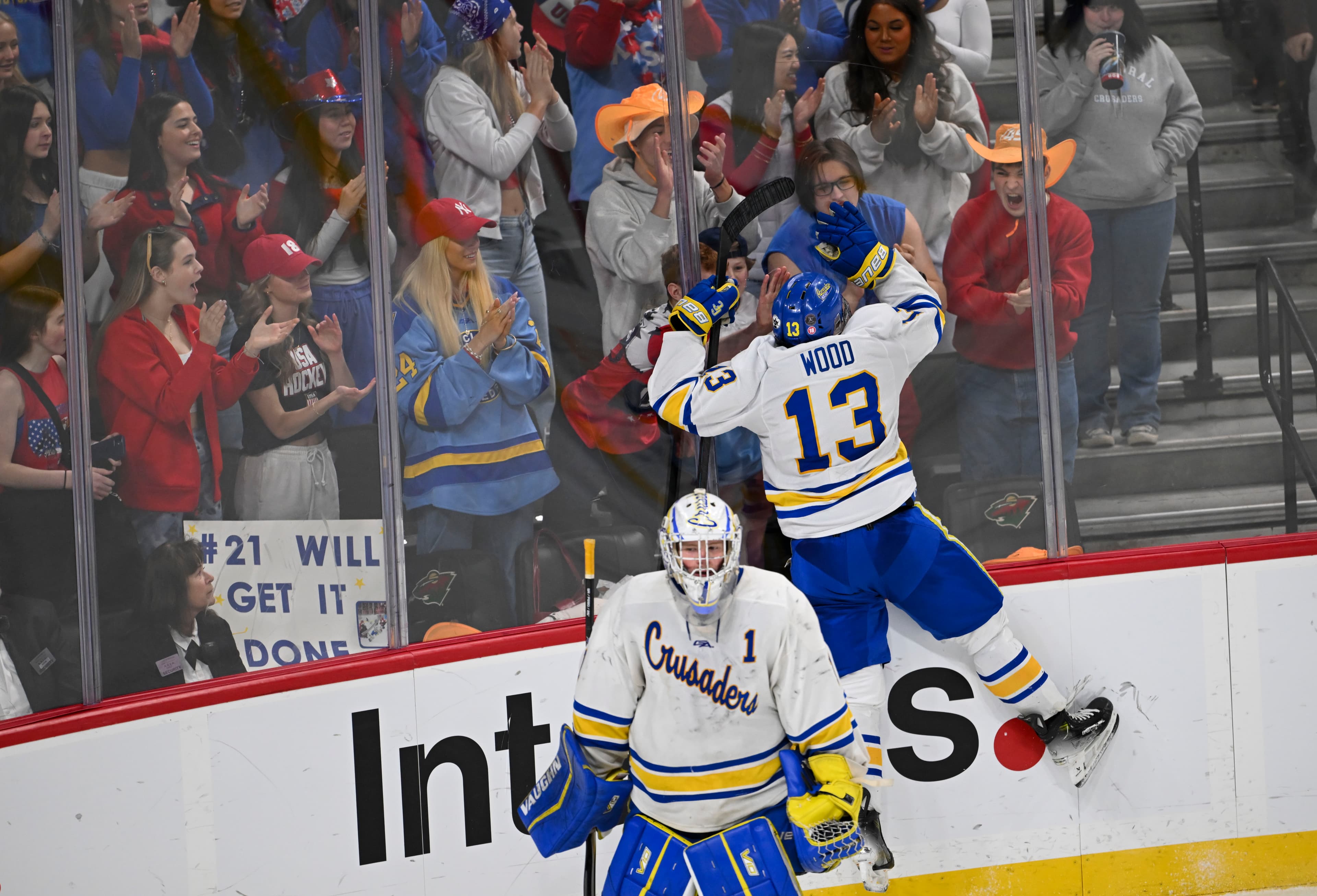 Cathedral scored 32 seconds into a second-period power play to take a 3-0 lead. Wood made a pass from behind the net to freshman Bo Schmidt who got the puck past goaltender Evan Schmidt’s glove. It was Bo Schmidt’s second goal of the tournament and 17th of the season.