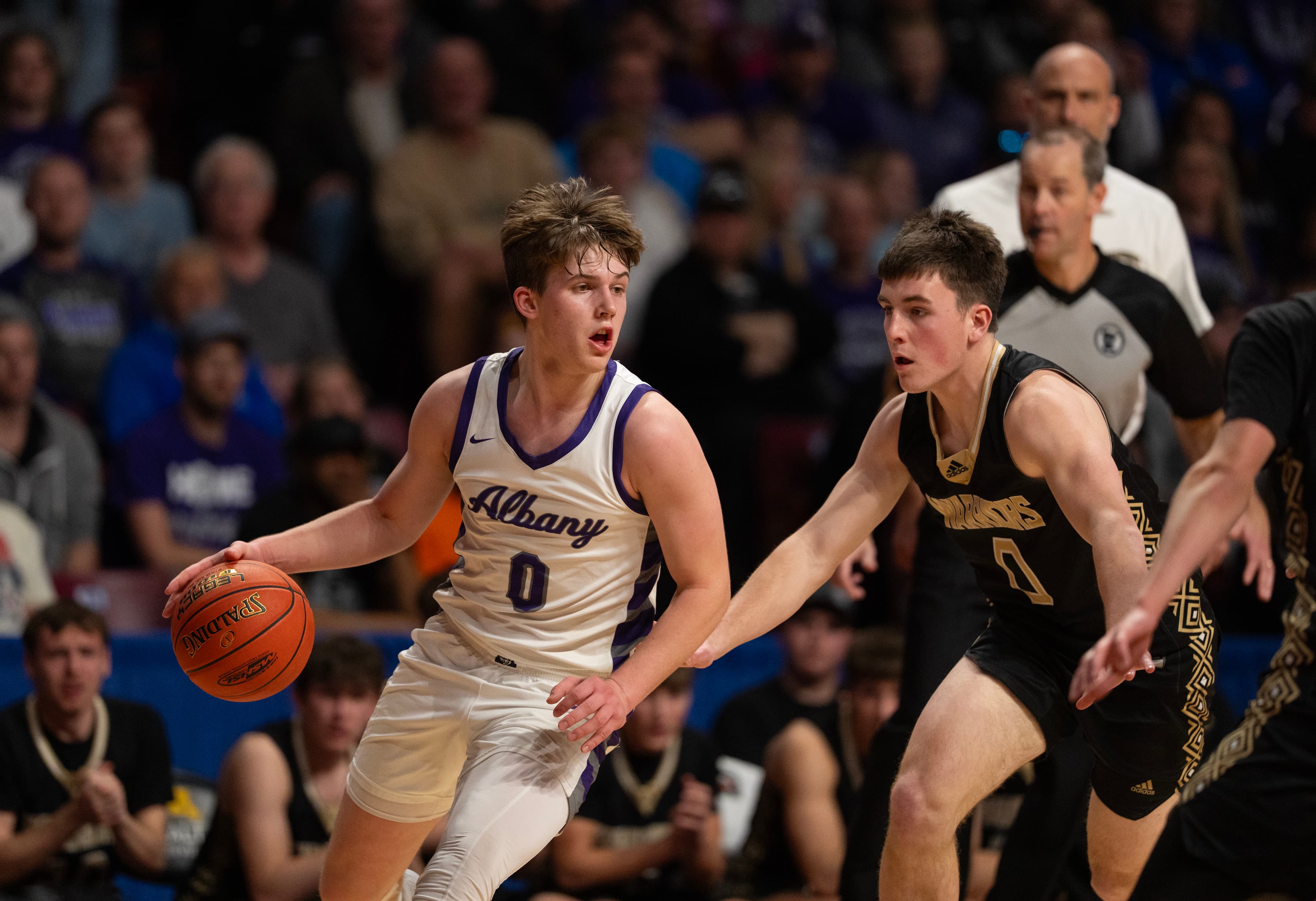 Top-seeded Albany put on a three-point clinic against Caledonia in the first half and then held off a comeback in the second for a 59-54 win in a Class 2A boys basketball state tournament semifinal on Friday at Williams Arena.