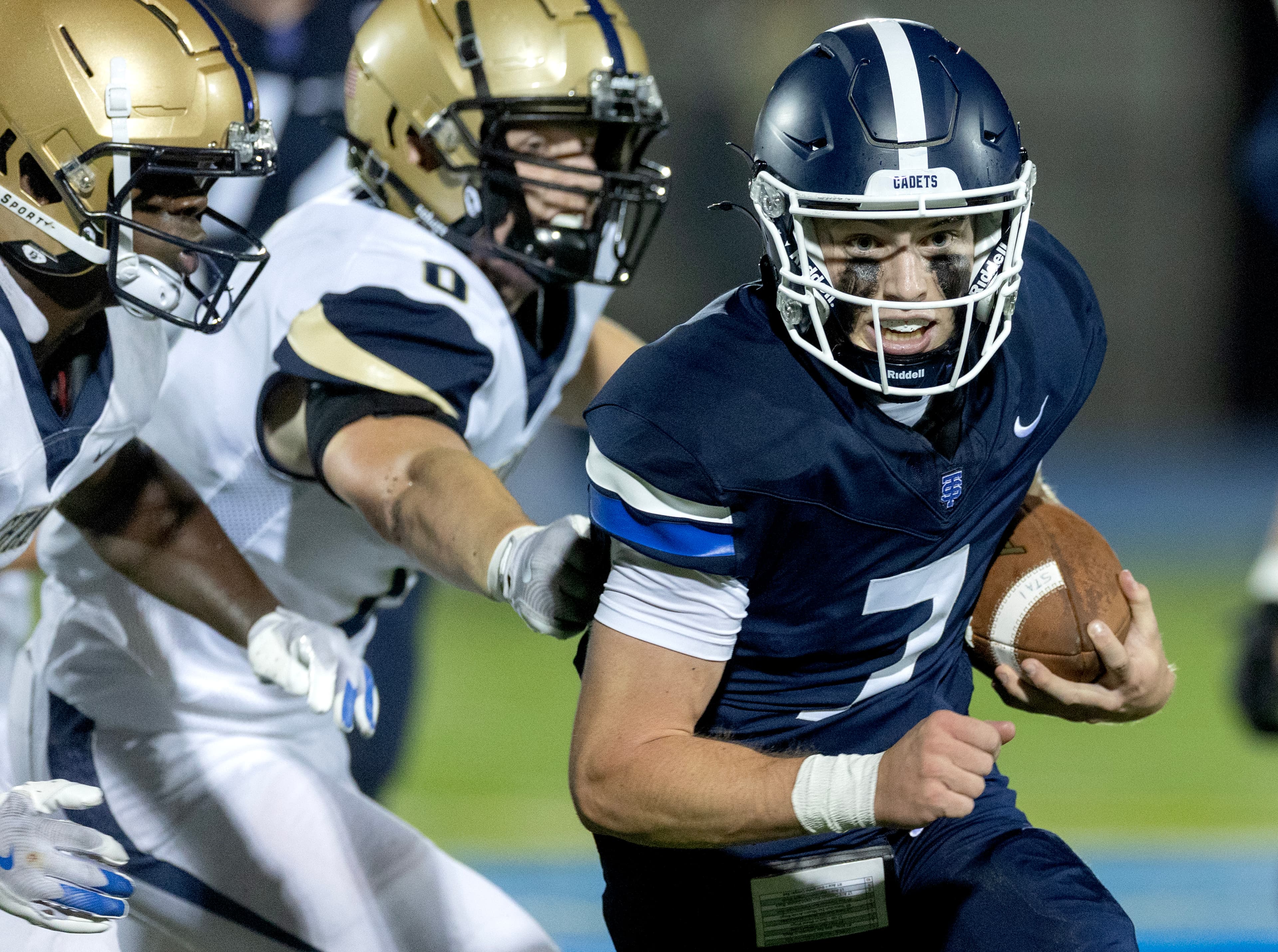 St. Thomas Academy struck back, putting together a 10-play drive of its own. The Cadets tied the score when running back Dominic Baez sidestepped a tackle at the line of scrimmage, then sprinted 42 yards to the end zone to tie the score.