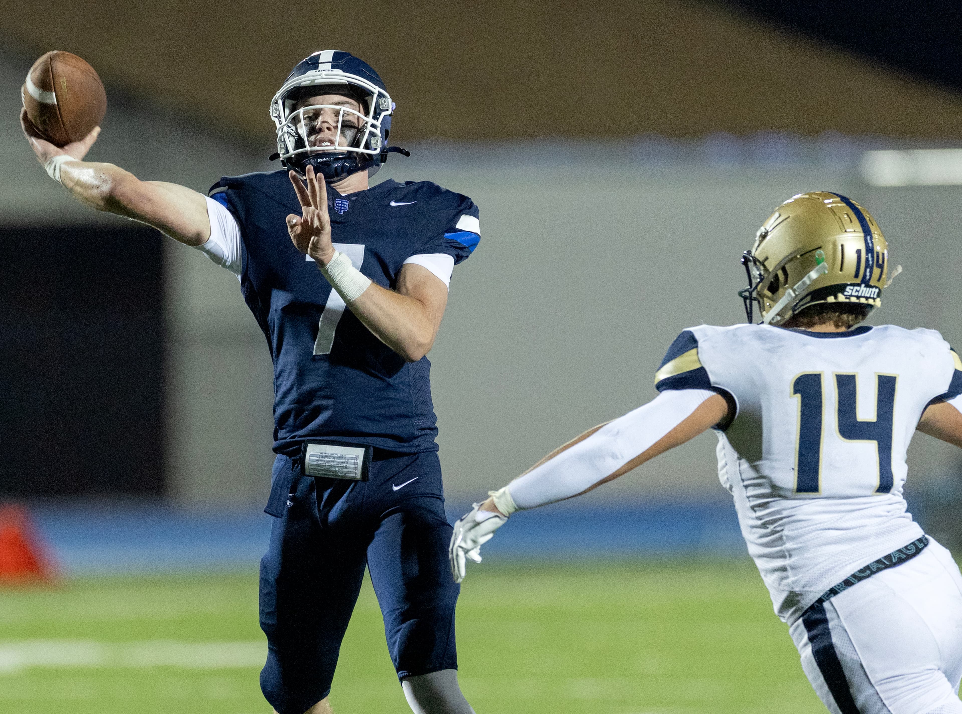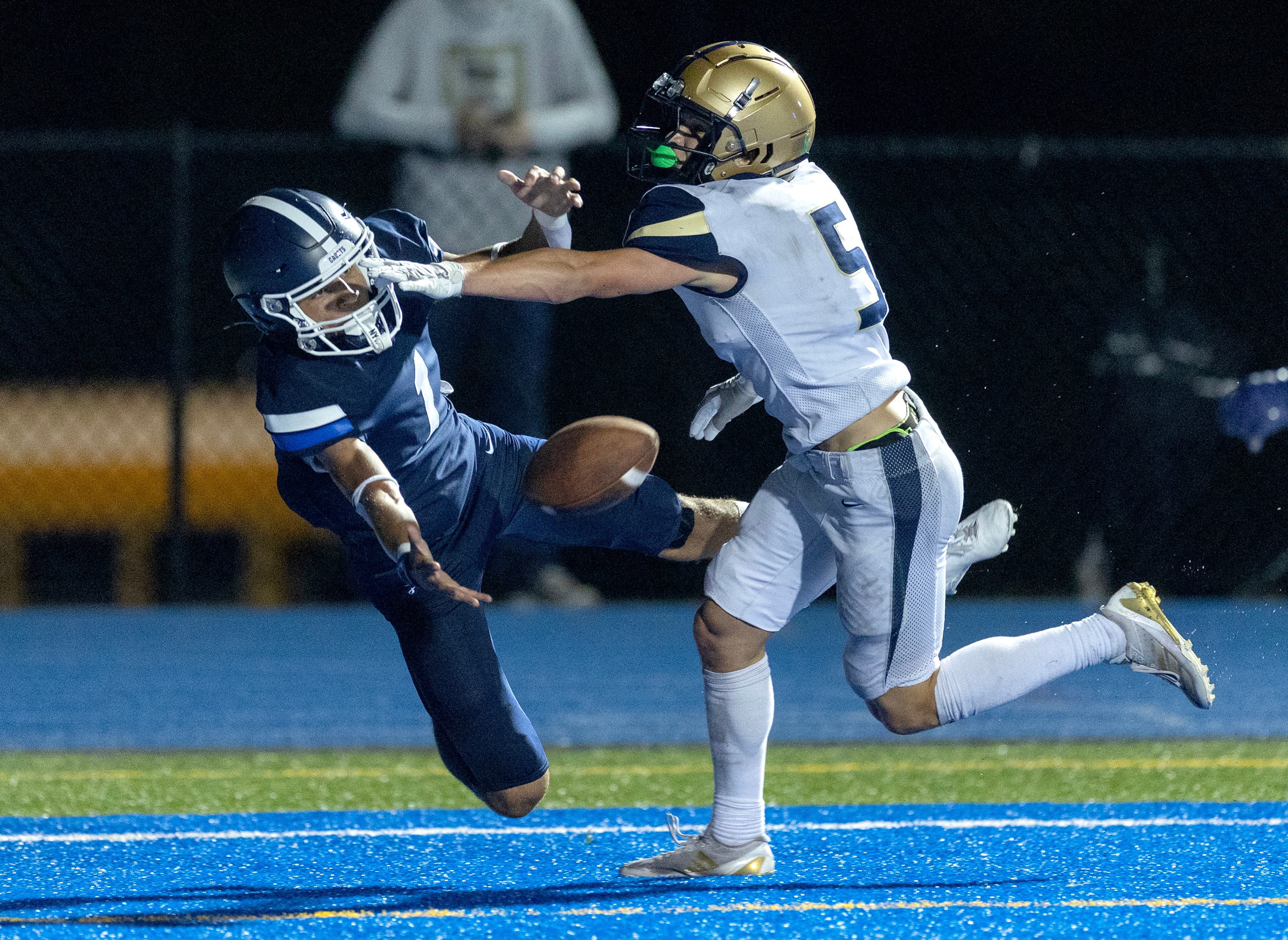 St. Thomas took the lead for good when tight end Luke Hudson leaped over Chanhassen defenders to haul in a pass from quarterback Tristan Karl. After the successful extra point, the Cadets led 14-13.