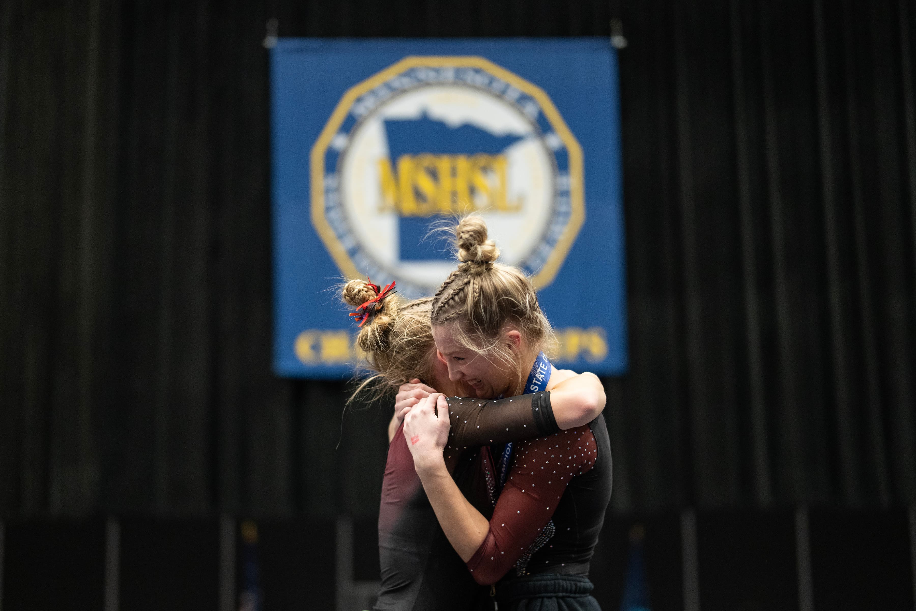 Hansen finished with a meet-winning score of 37.475, outpointing Detroit Lakes’ Maggie Schander, who vaulted into second place on the strength of the best single-event score of the day, a 9.775 vault, for an overall 37.35. Esget was third with a 37.325. Hadassa Gonzalez of Mound-Westonka/Watertown-Mayer won the balance beam with a 9.3875.