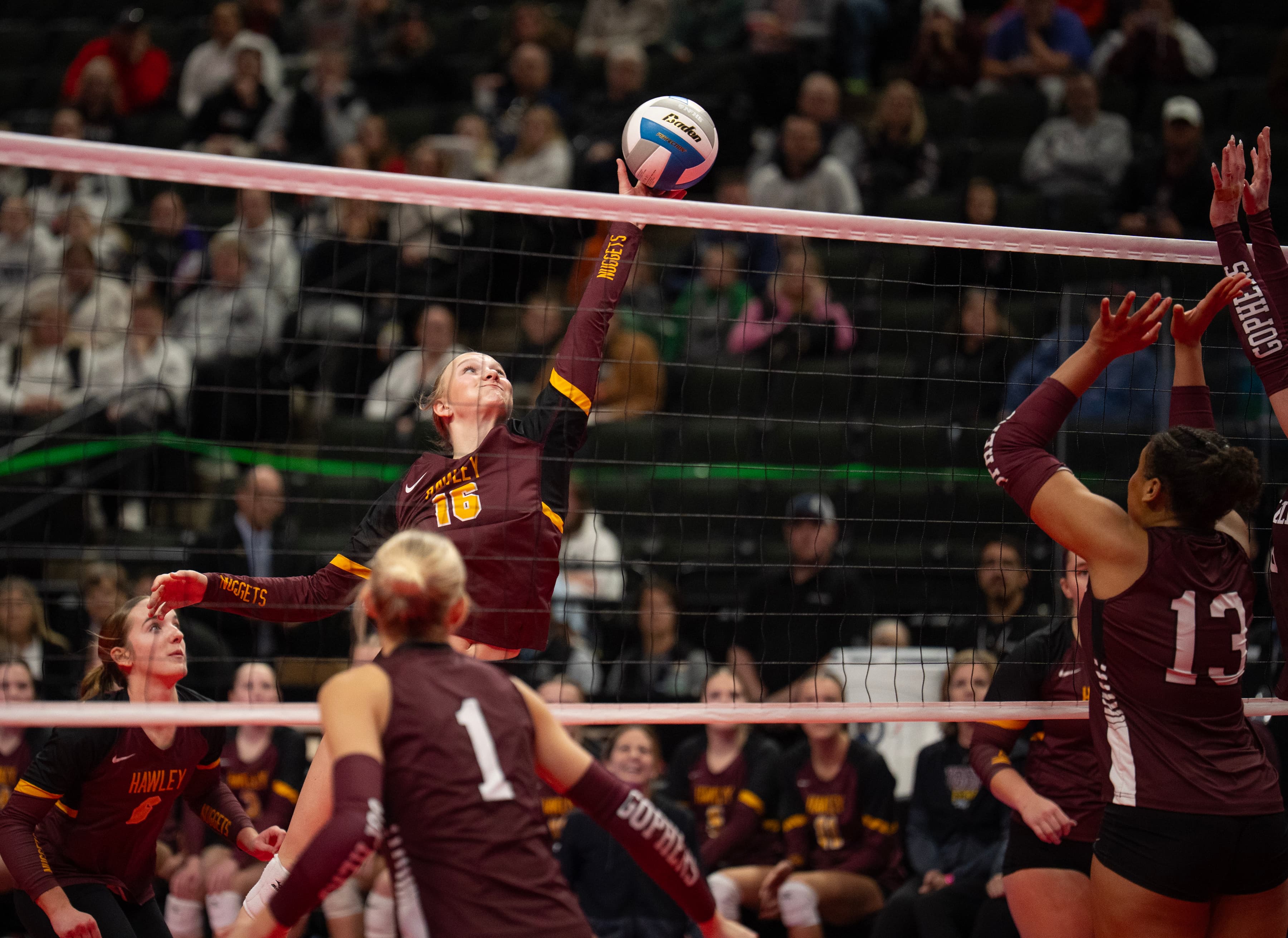 Hawley’s Annaka Johnson was a force at the net in the semifinals on Friday. She was relatively quiet in the title match until taking over during an 11-3 run in the third set. Her three kills helped the Nuggets take their biggest lead of the match. Katie Vetter was also huge defensively with 18 digs already.