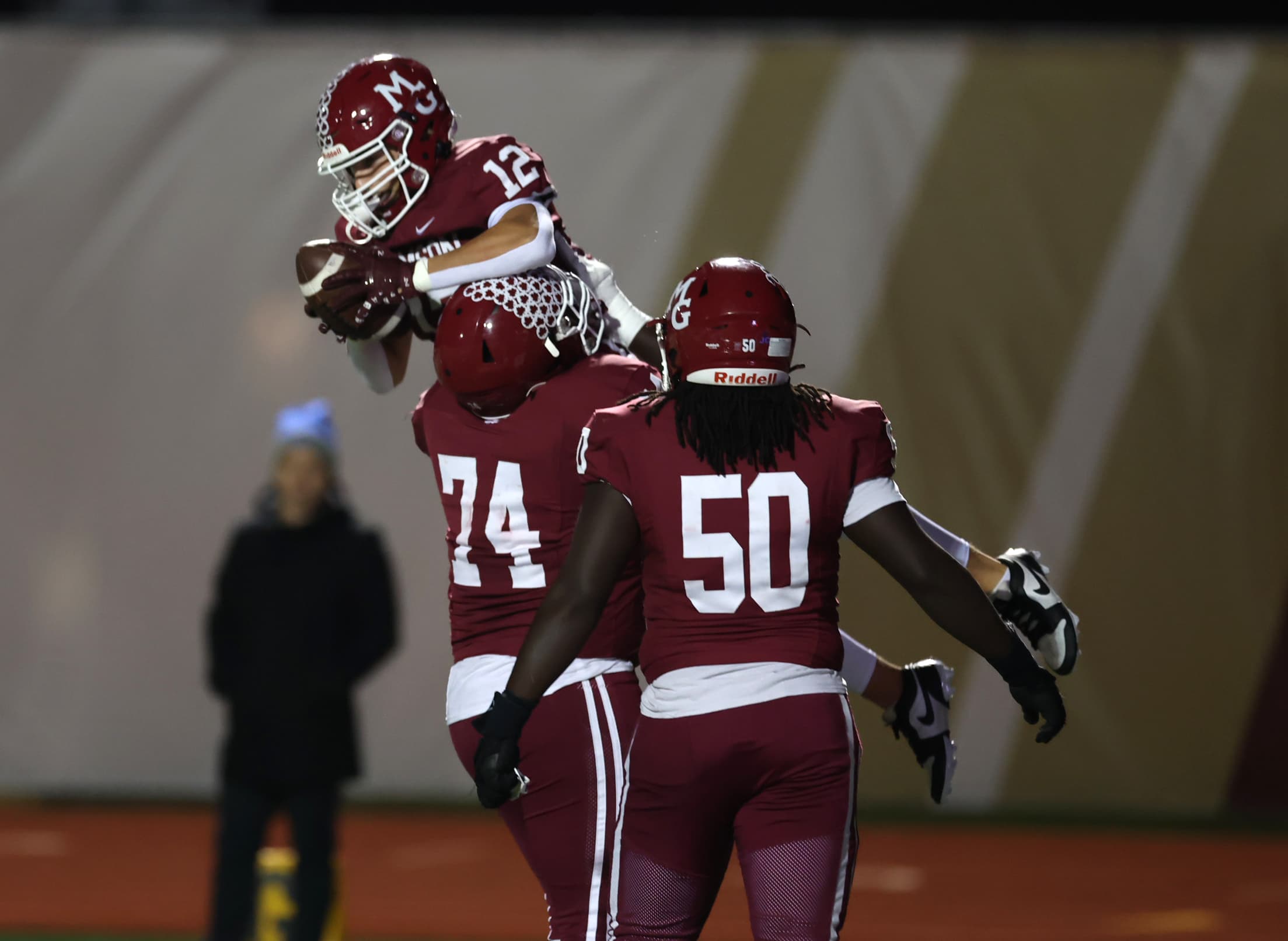 Maple Grove made a statement, taking the second-half kickoff and going 80 yards in 12 plays, taking 6:28 off the clock. QB Kaden Harney scored on a 6-yard keeper around left end to make the score 17-14 Crimson.