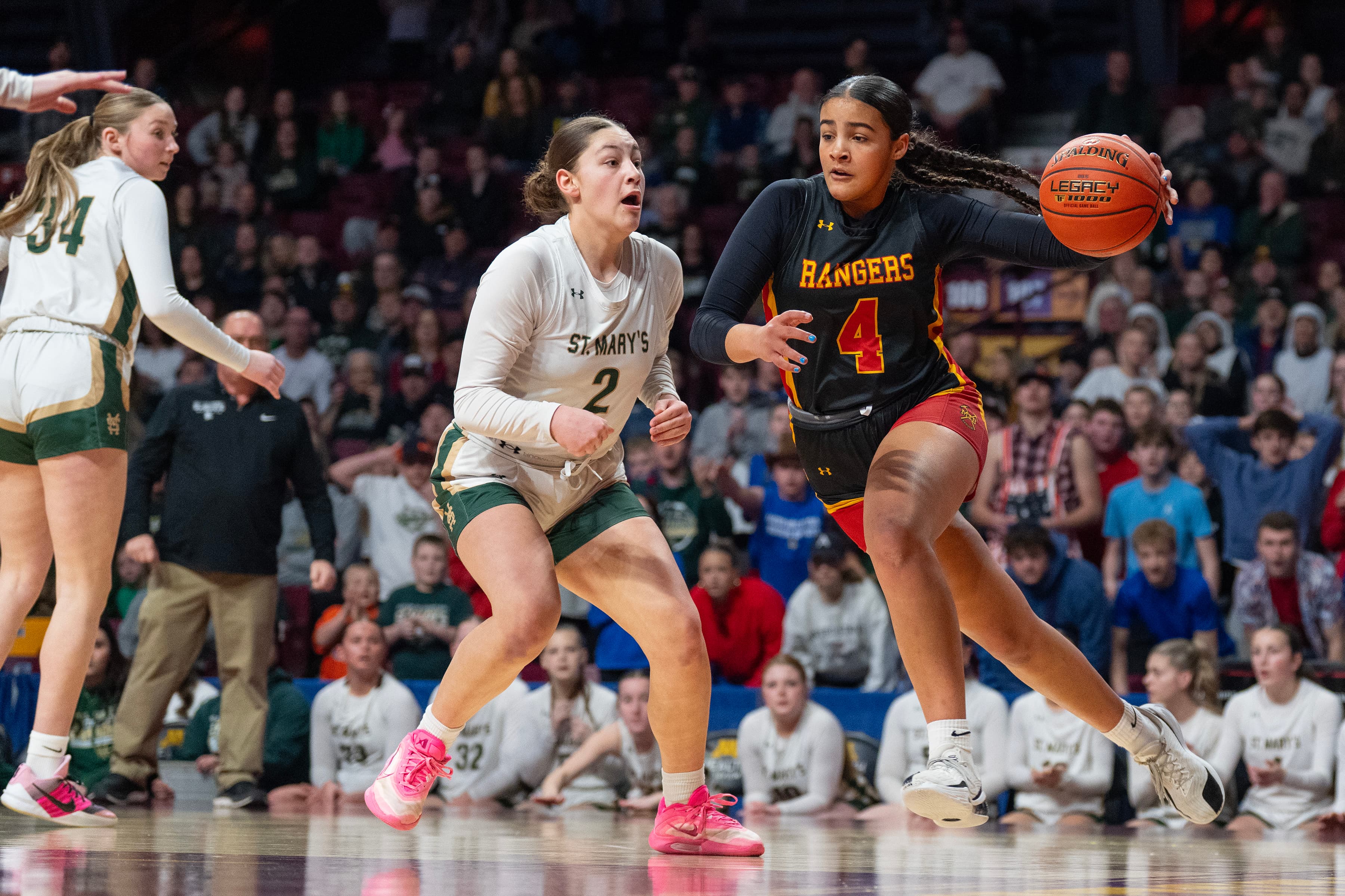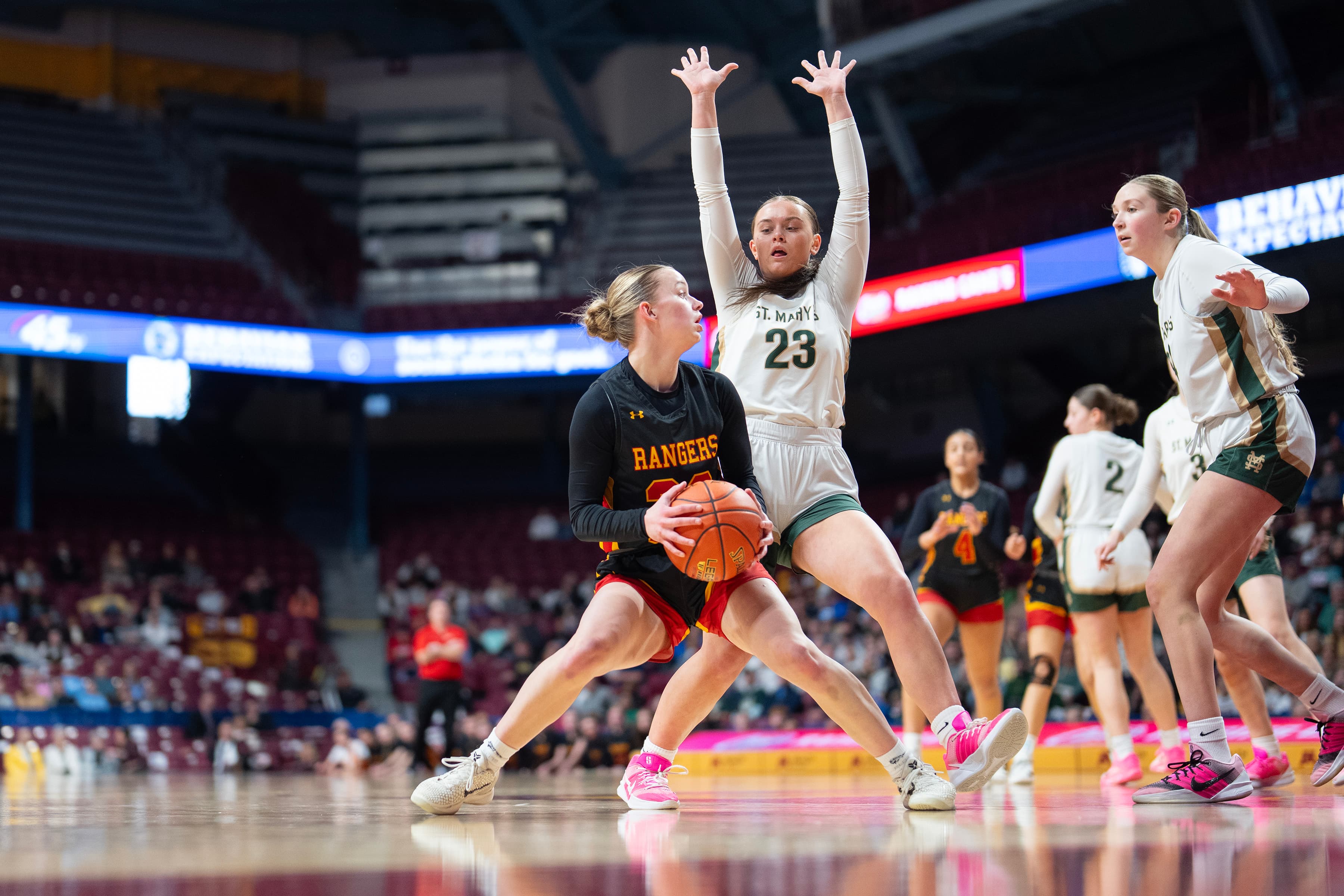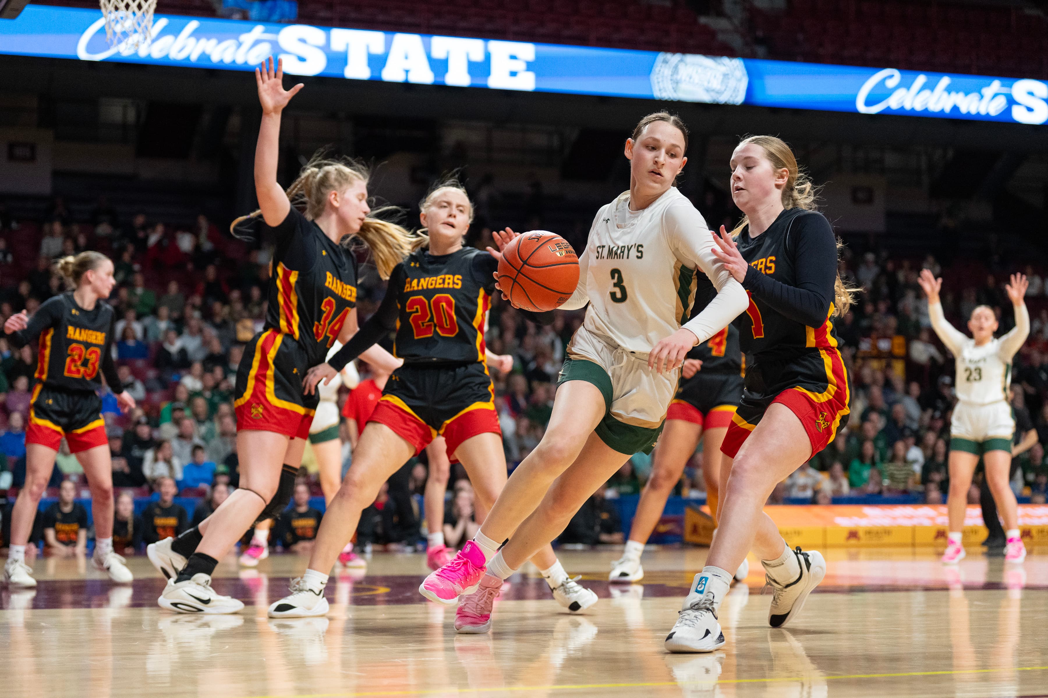 Sleepy Eye St. Mary’s expected the Rangers to start the first half with the reputation they’d built all season: Plenty of three-pointers. But Mountain Iron-Buhl tipped off uncharacteristically slow on the state tournament stage. By halftime, the Rangers hadn’t made a single three-pointer in 13 tries. The Knights, in contrast, were up 42-16, with top scorer and junior guard Morgan Mathiowetz putting away 18 points and three three-pointers.