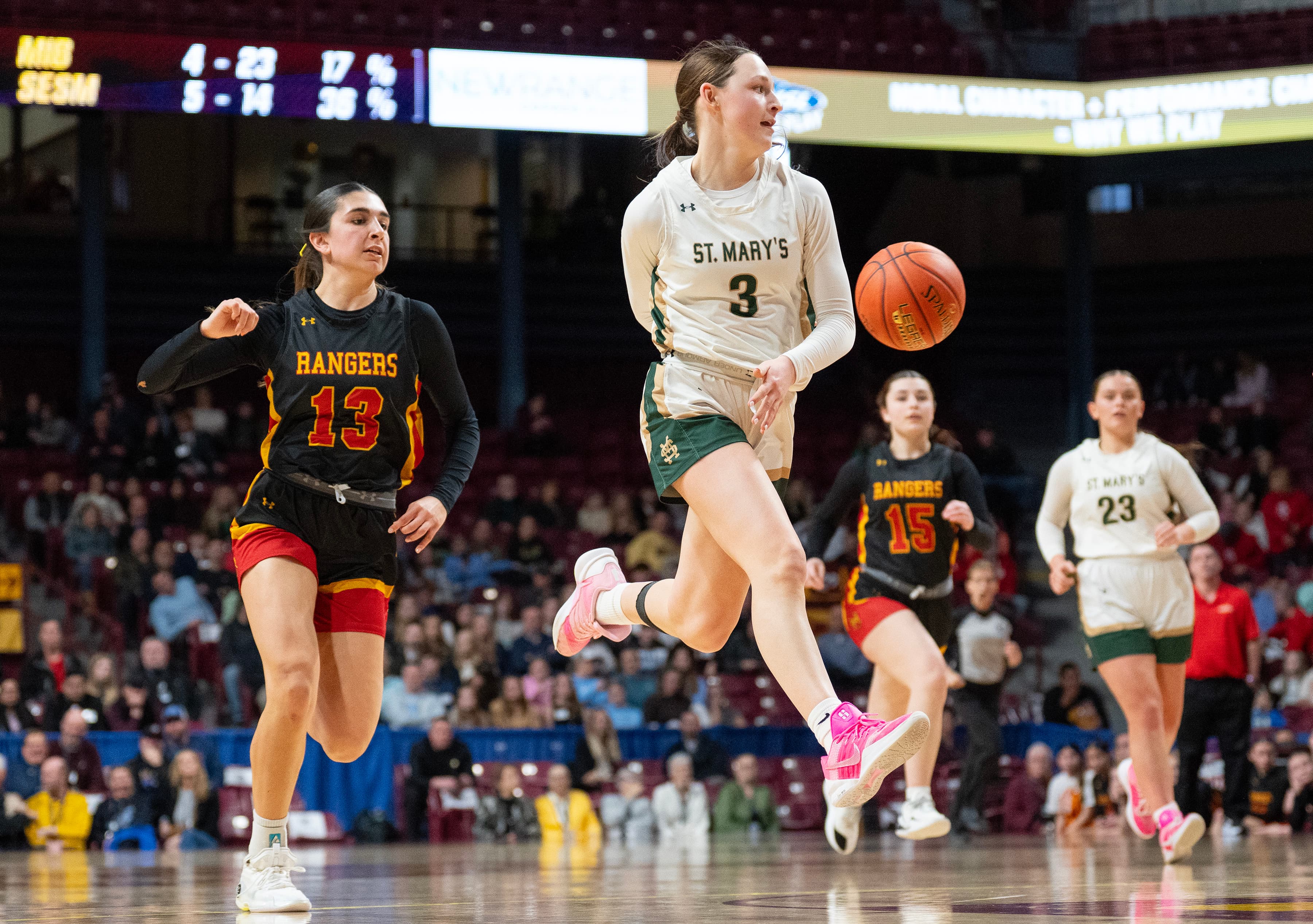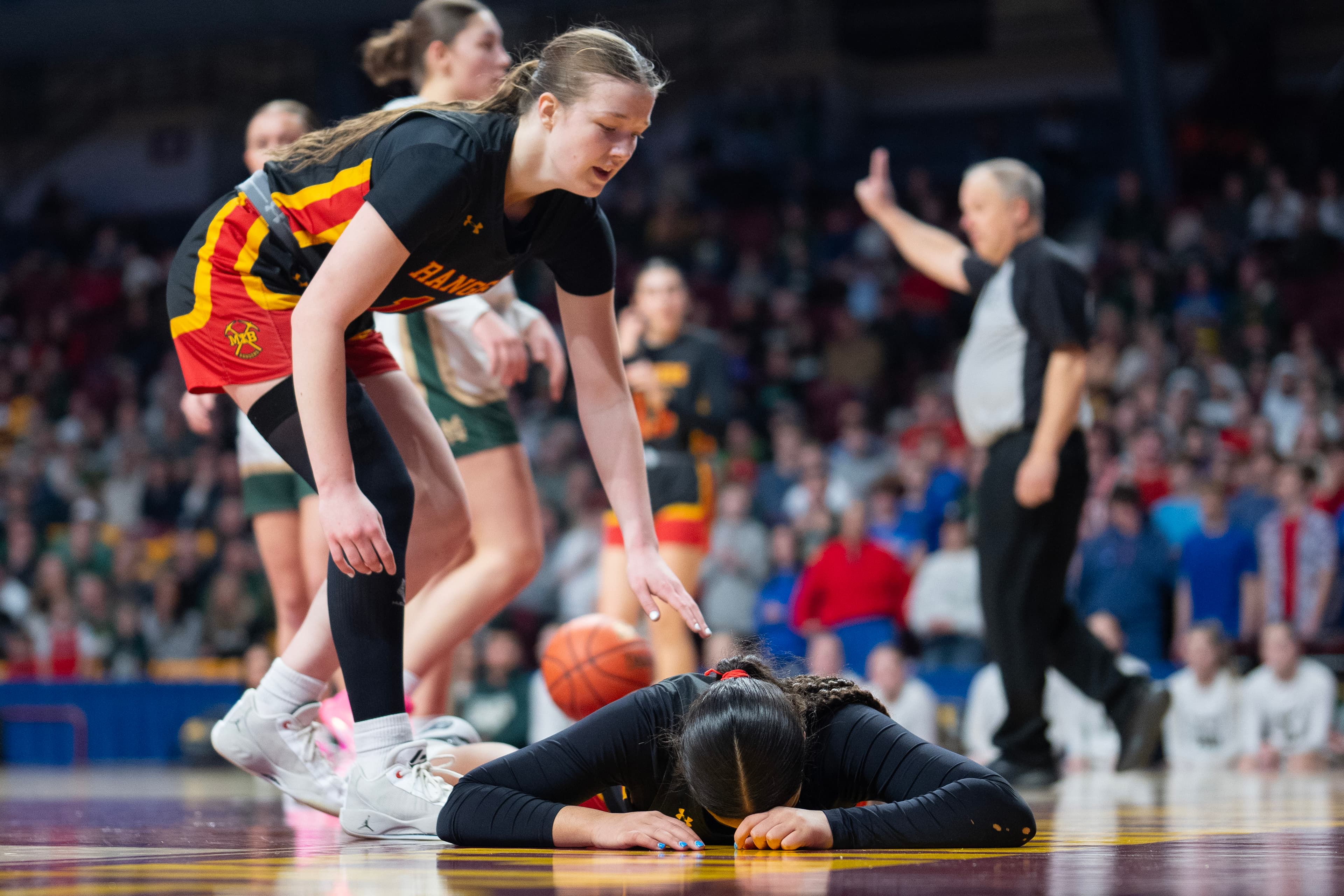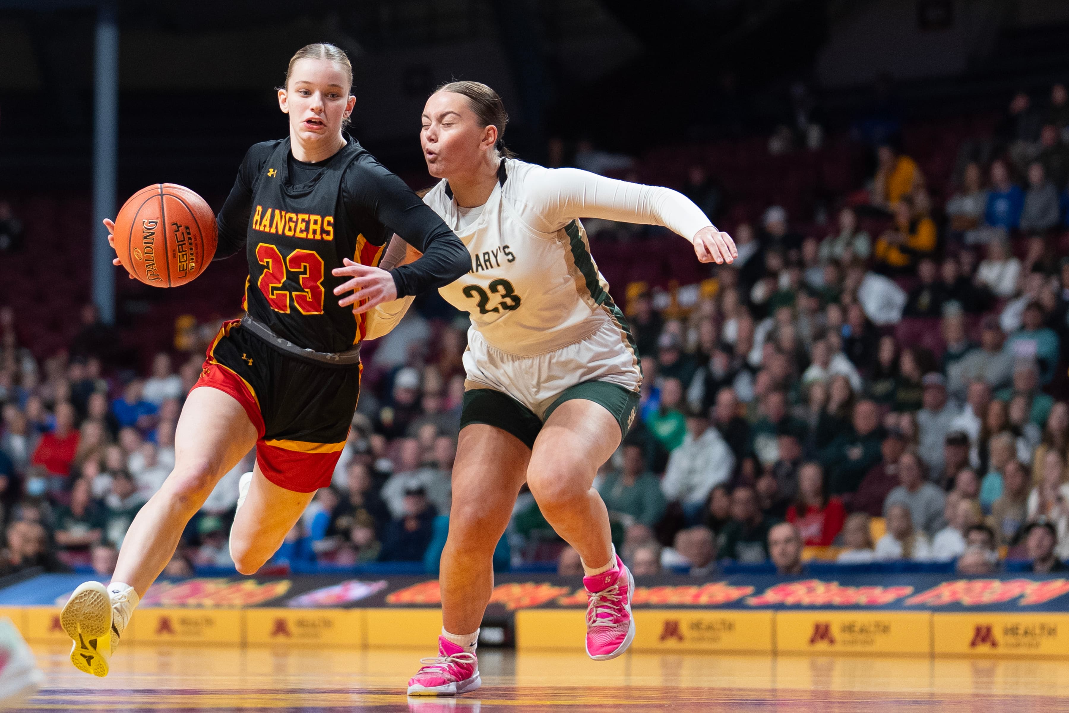 Sleepy Eye St. Mary’s expected the Rangers to start the first half with the reputation they’d built all season: Plenty of three-pointers. But Mountain Iron-Buhl tipped off uncharacteristically slow on the state tournament stage. By halftime, the Rangers hadn’t made a single three-pointer in 13 tries. The Knights, in contrast, were up 42-16, with top scorer and junior guard Morgan Mathiowetz putting away 18 points and three three-pointers.