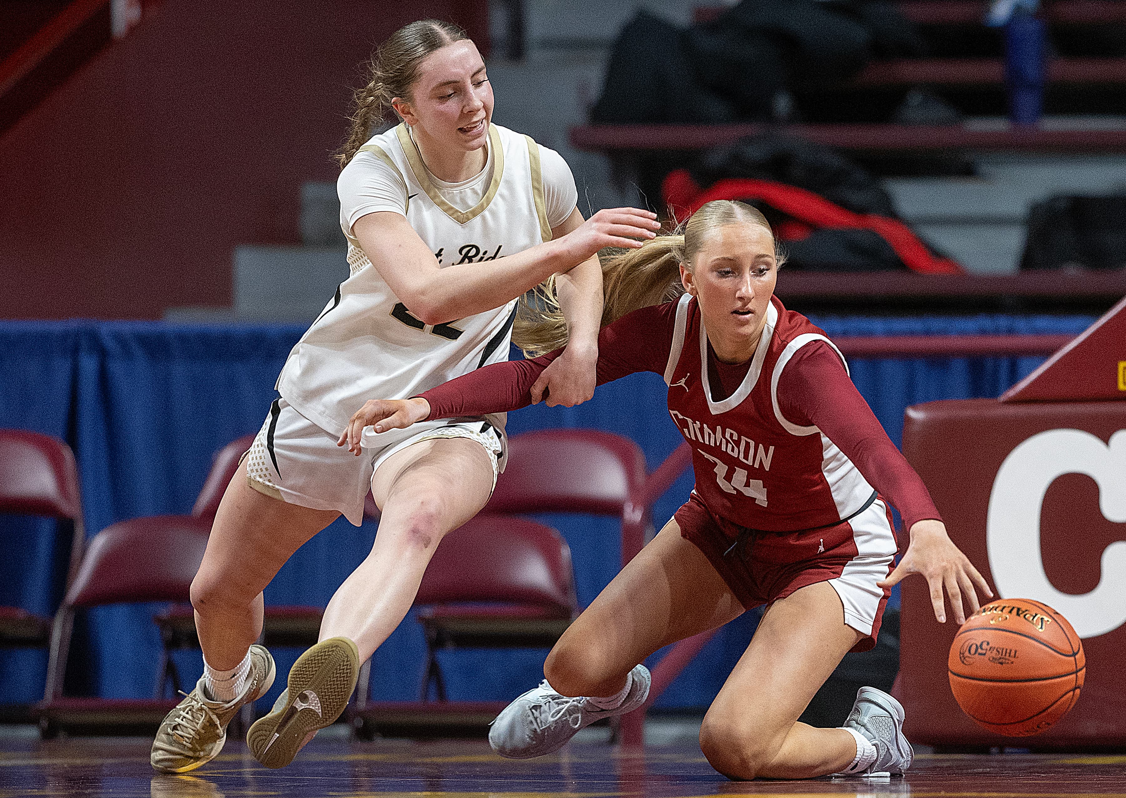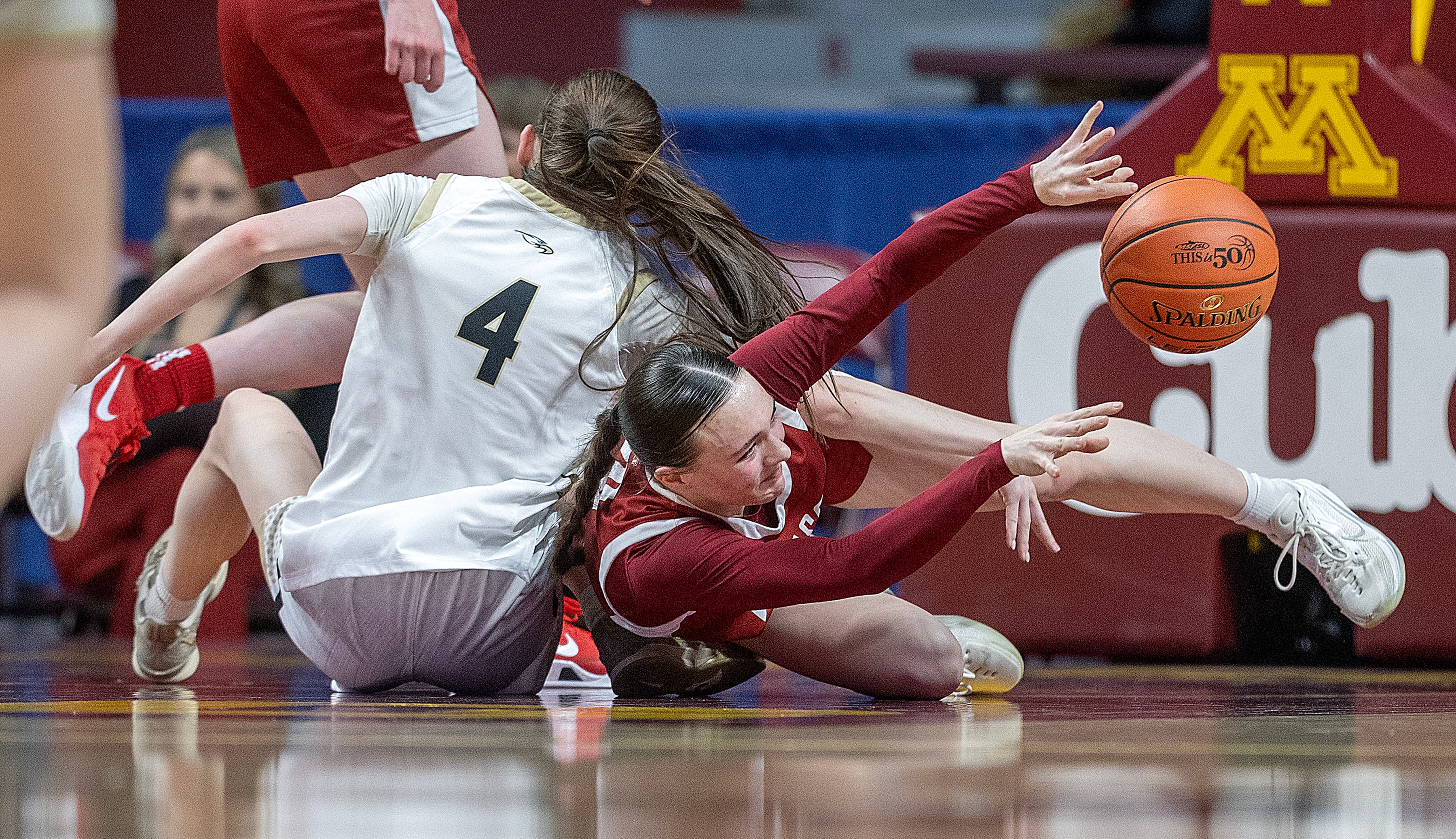 Halfway through the first half, and No. 4 seed Maple Grove has the early edge on No. 5 East Ridge. The Crimson’s All-Minnesota guards, Kate Holmquist and Sophia Anderson, are playing like it, with eight and five points scored, respectively, so far, while East Ridge’s All-Minnesota senior guard Vienna Murray and sophomore forward Amelia Ecker each have four points for the Raptors. Both teams already have five players with points.