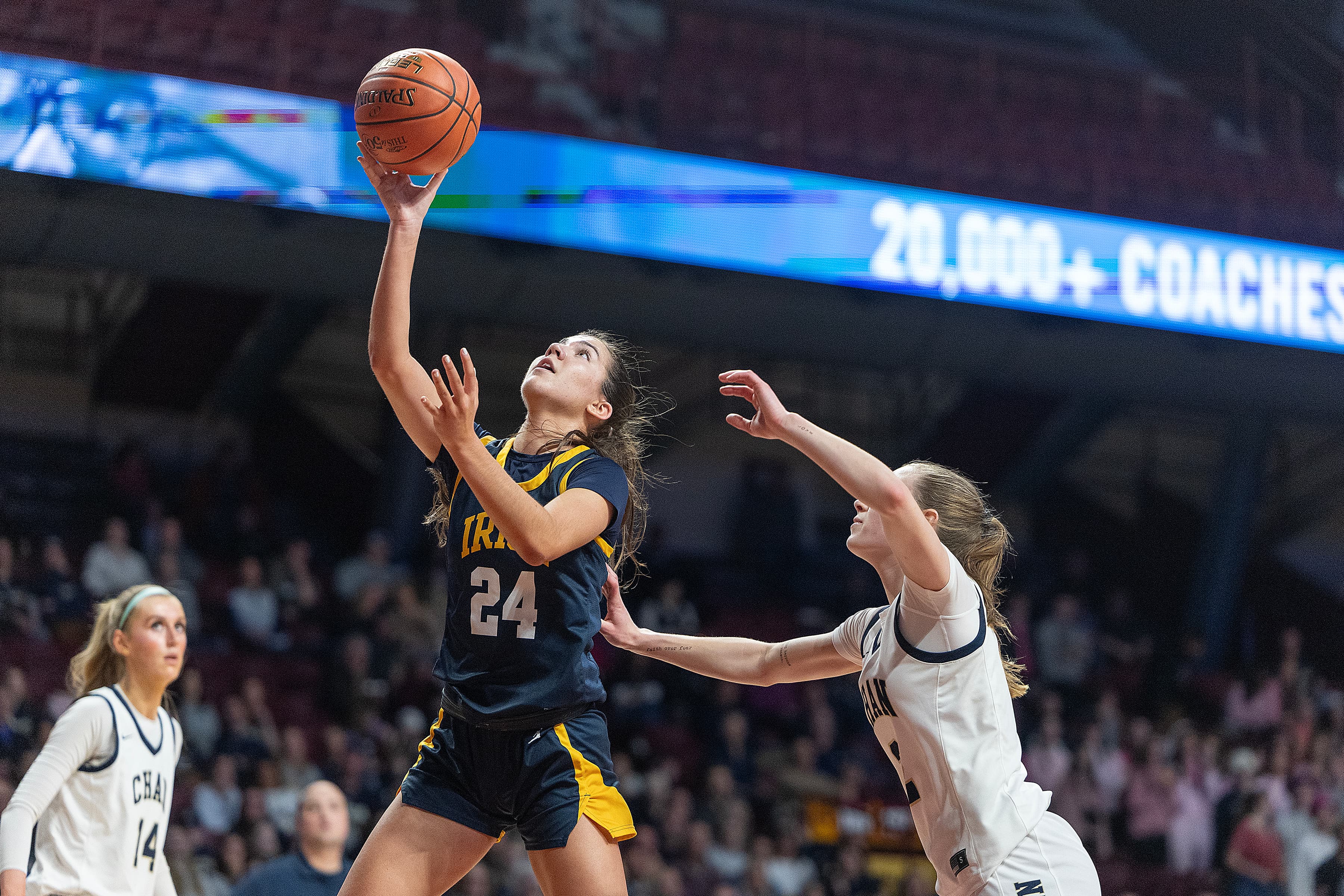 Six minutes in and this Hopkins defense is tough to beat, quick to swarm in the paint and lock down on the perimeter, giving the Royals a 17-2 lead over Blaine. The Royals, on average, conceded just over 53 points per game through a tough regular-season schedule, and today, they’ve already forced Blaine into a shot-clock violation and a total of seven turnovers just a third of the way through the first half. Eighth-grade forward Marianna Davis leads the Royals with seven points, earning chants of “She’s a baby!” (a compliment, from her own student section) after drawing an and-one.