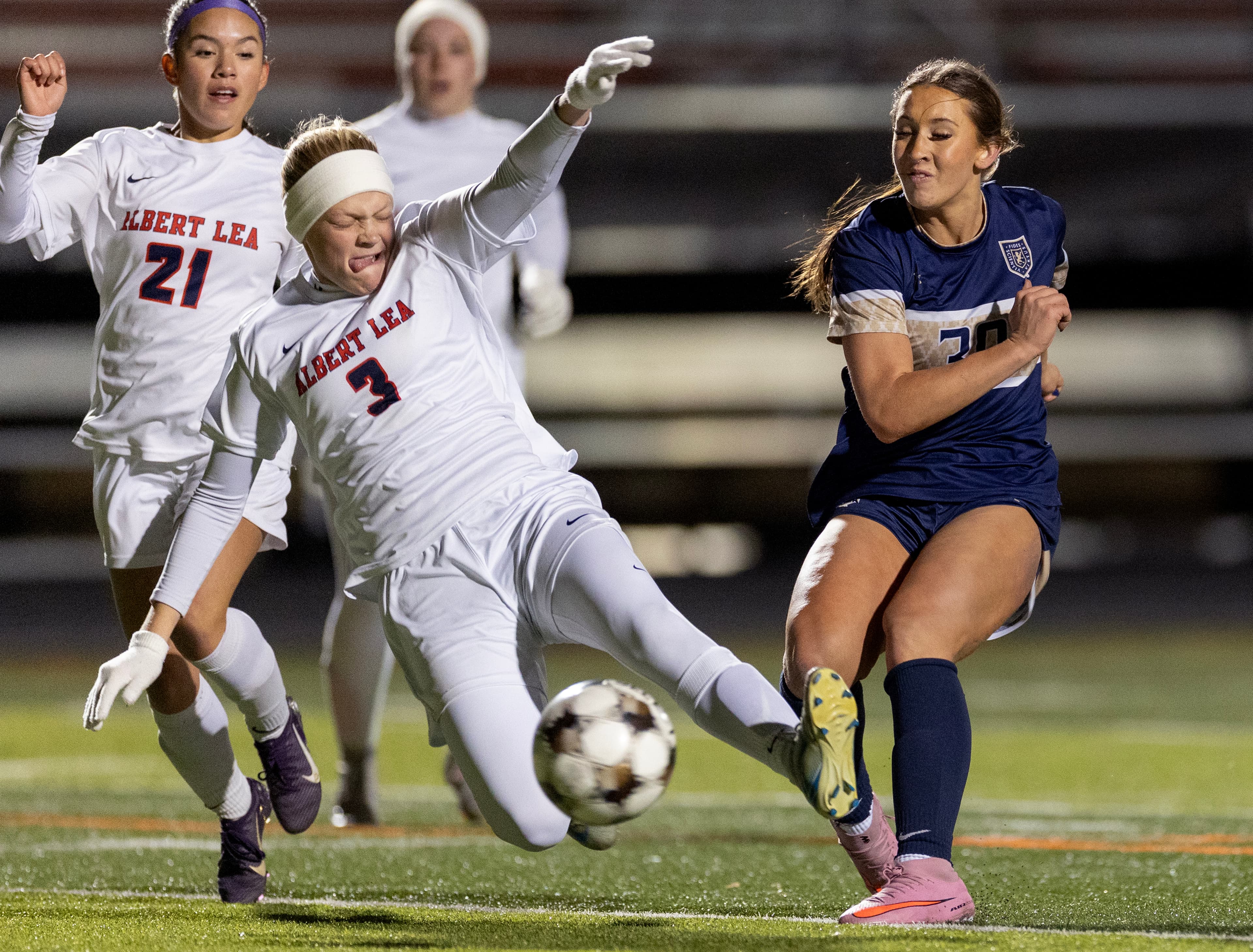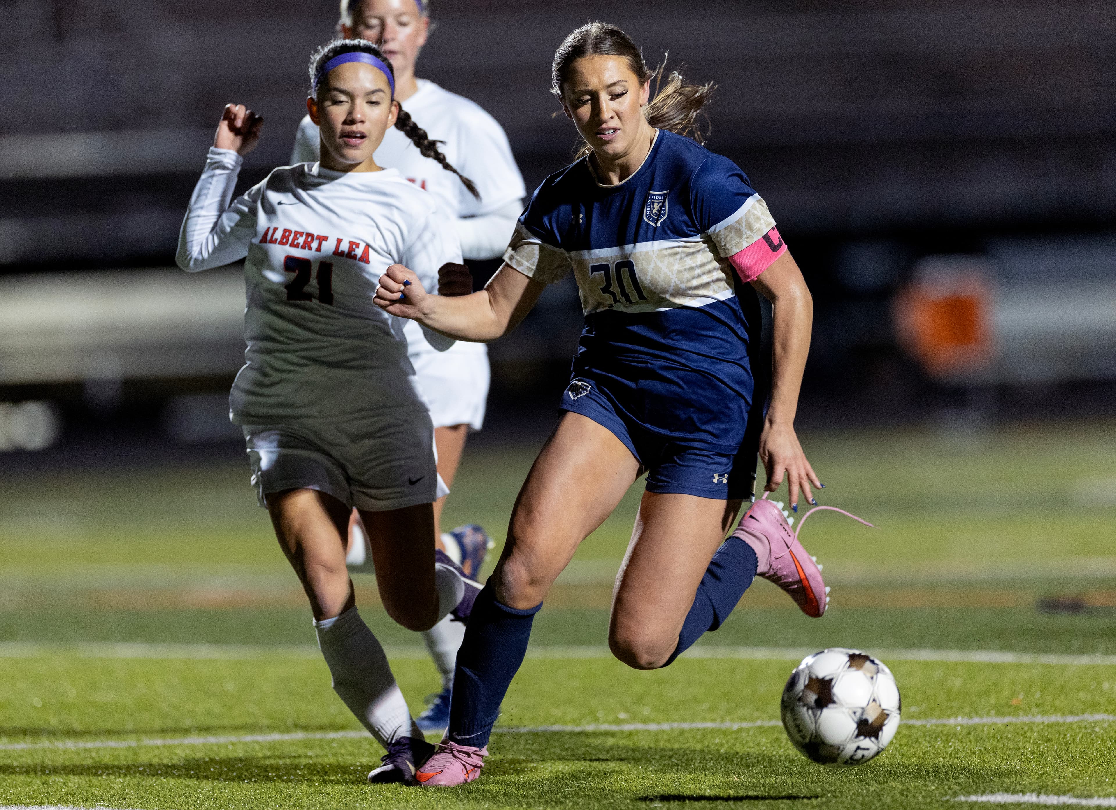 Maddyn Greenway, Class 1A’s Ms. Soccer winner and Minnesota’s all-time leading goalscorer, bagged a first-half hat trick to put the Lions up 4-0 at the break. She scored four more times in the first dozen minutes of the second half.