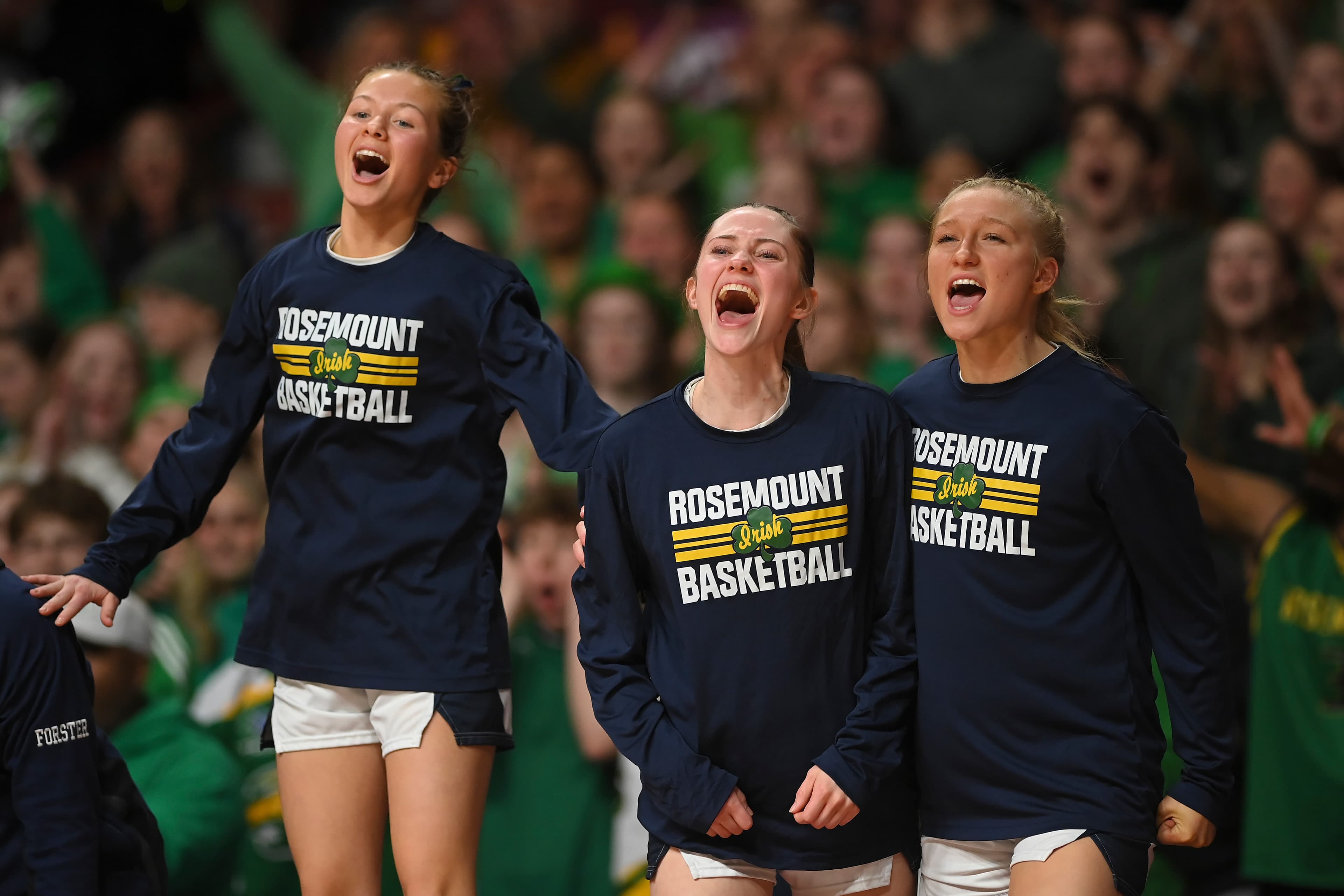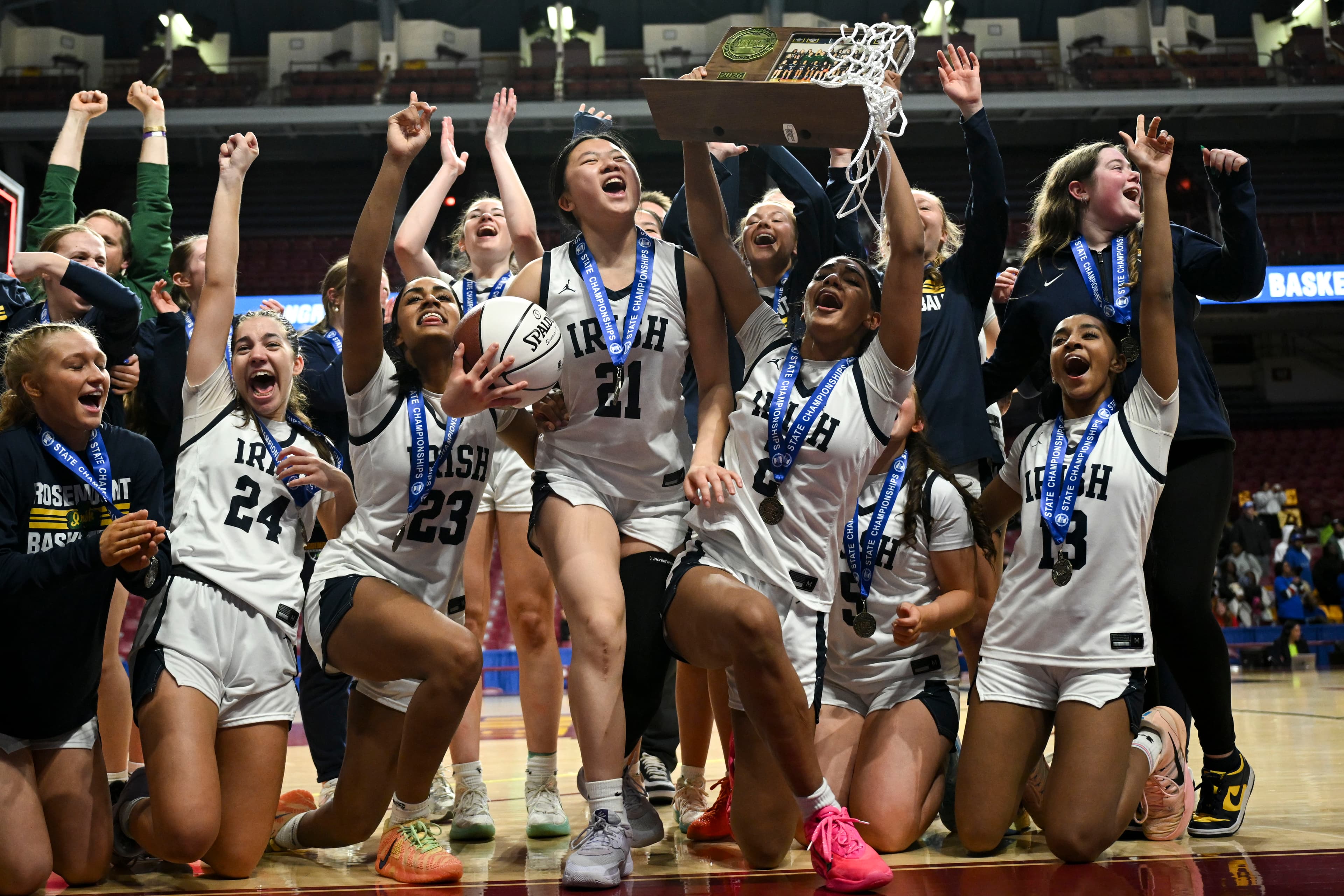 After upsetting defending champion Hopkins 63-62 to claim Rosemount’s first Class 4A girls basketball state title on Saturday, March 14, at Williams Arena, the No. 2-seeded Irish knew they would be singing the loudest, most rambunctious fight song of the season, and that a crowd would be waiting to celebrate in the gym once they were done.