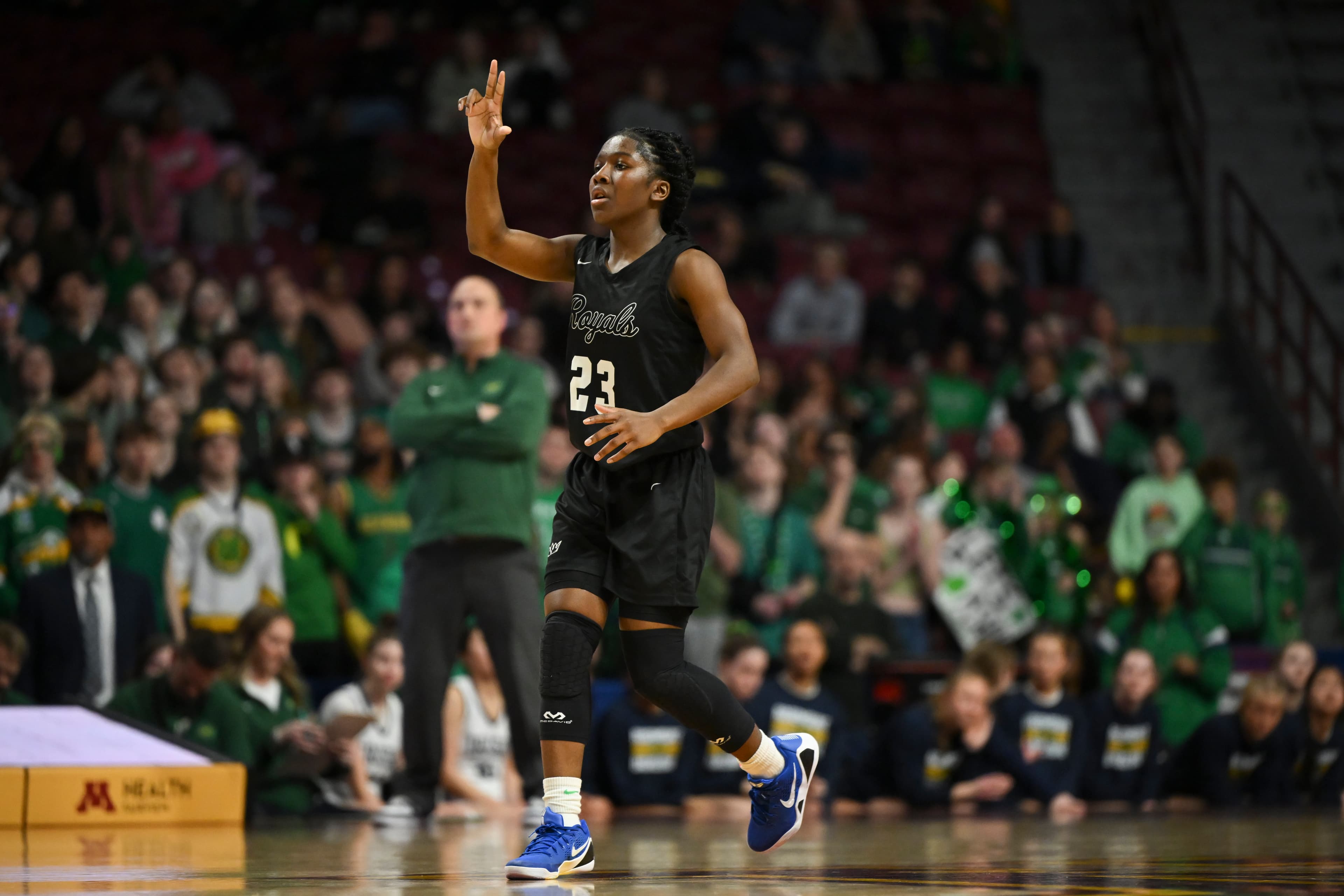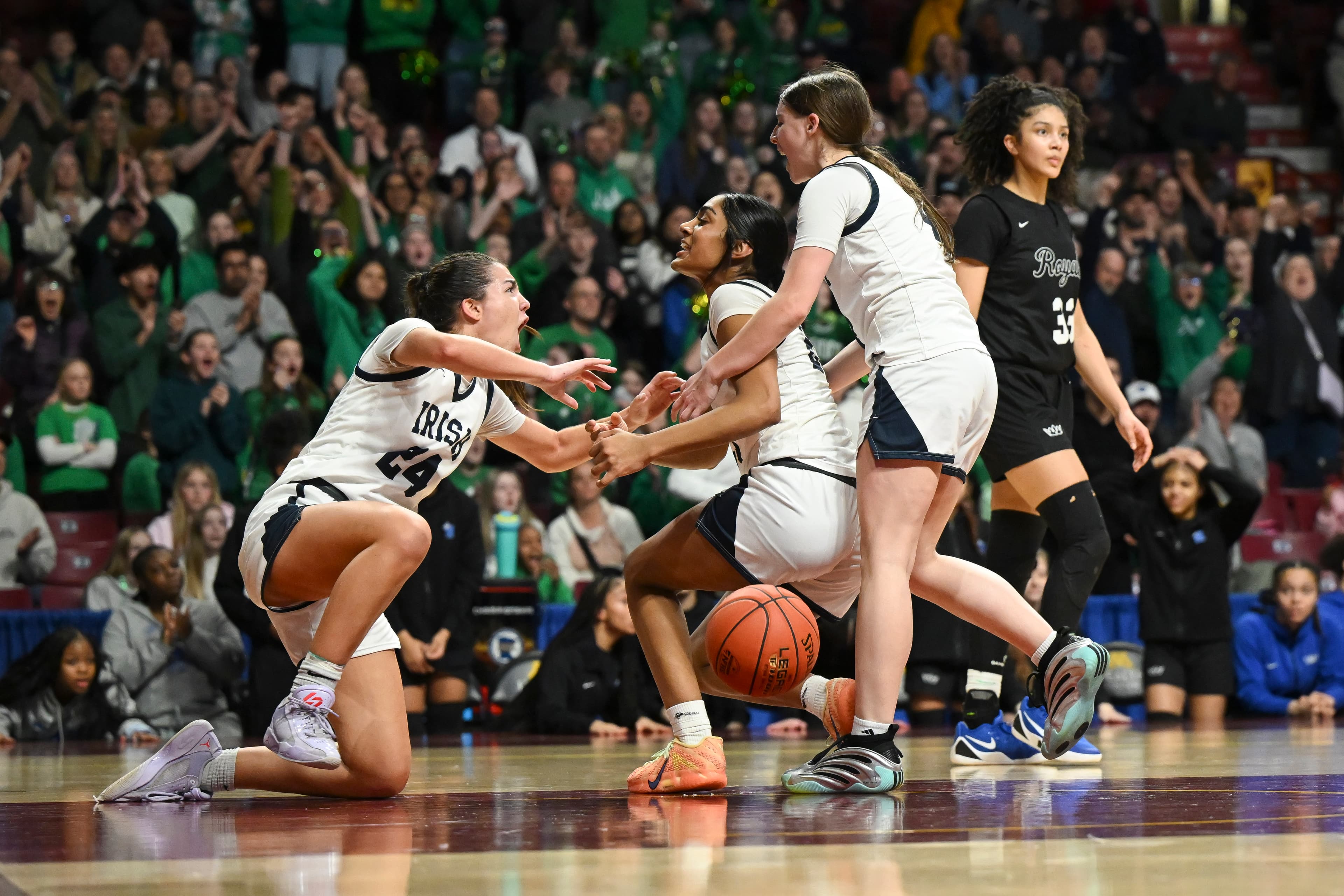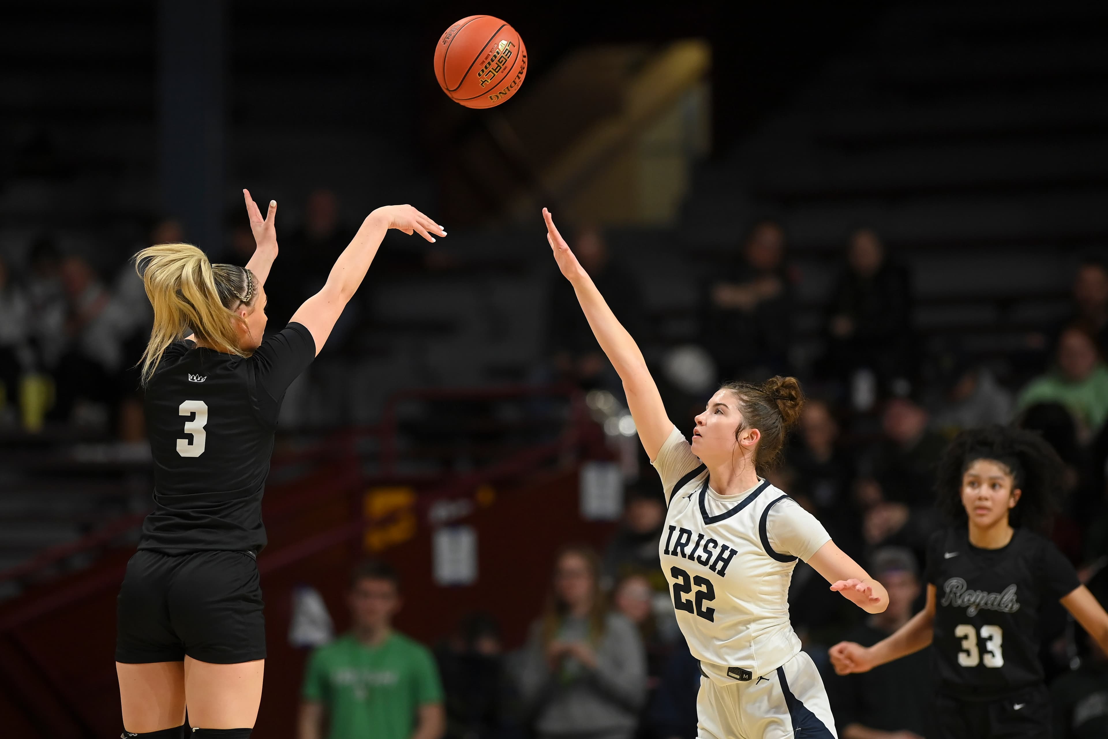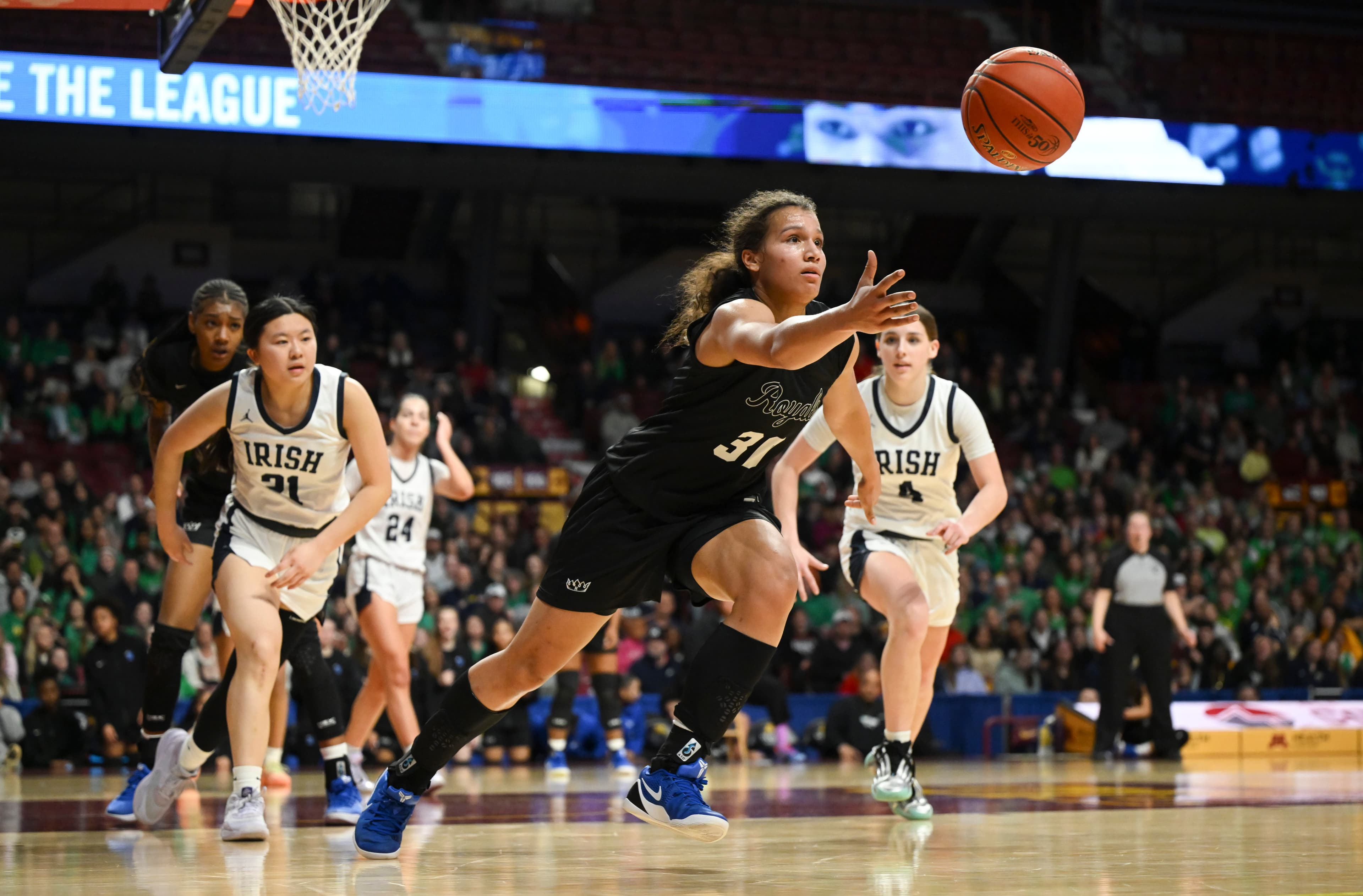 Amisha, an All-Minnesota Gophers commit, got to the rim often, scoring 15 points in the second half as Hopkins paid more attention — “every bit of it,” said Royals coach Tara Starks — to the Irish’s perimeter threats. The Irish were uncharacteristically low volume from three-point range (2-for-8) headed into the final five minutes.