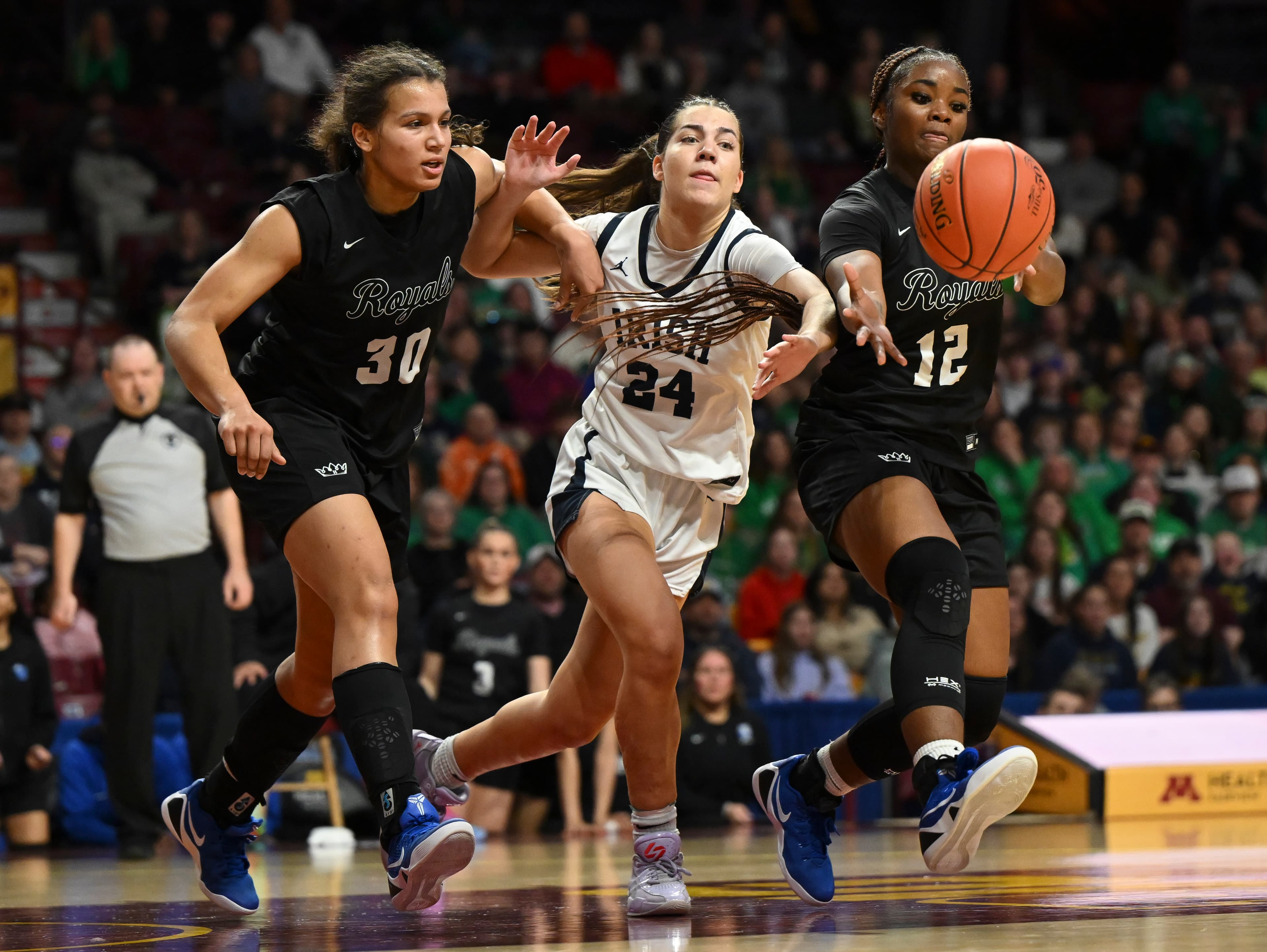 The play, which Starks said was intended to be a lob to Walker, broke down. Rosemount junior guard Isla Silk got a hand on a baseline jumper from Jaliyah Diggs, who led the Royals with 20 points and eight rebounds. Attempts at a buzzer-beating put-back couldn’t find the rim.