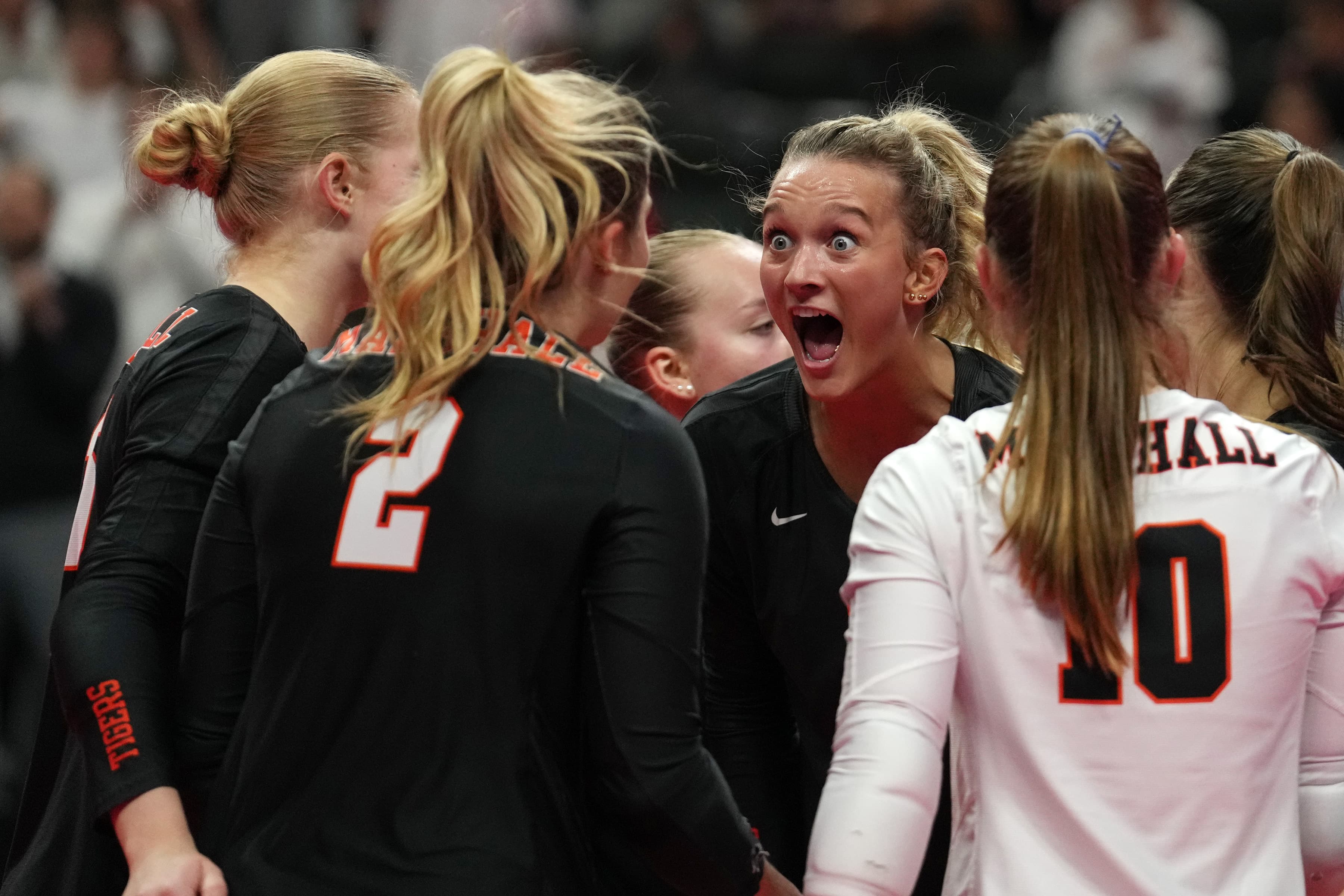 The Tigers pulled away again with three straight points in the middle of the first set, but the Raiders answered to keep from falling behind by double digits. Caroline Anetipa extended a long rally with two diving digs, but Marshall finished the point off with Reese Drake’s blast in front of the back row.