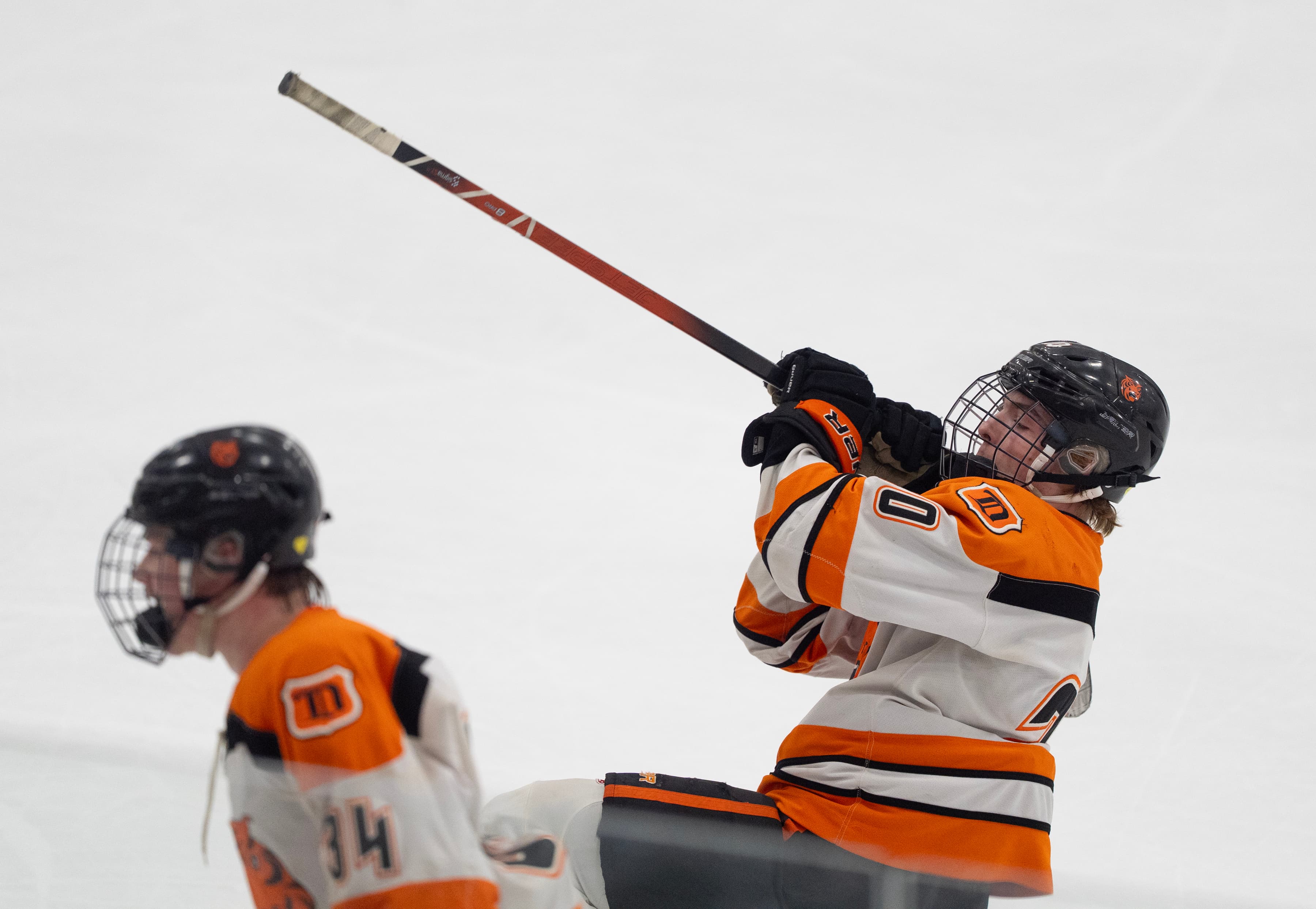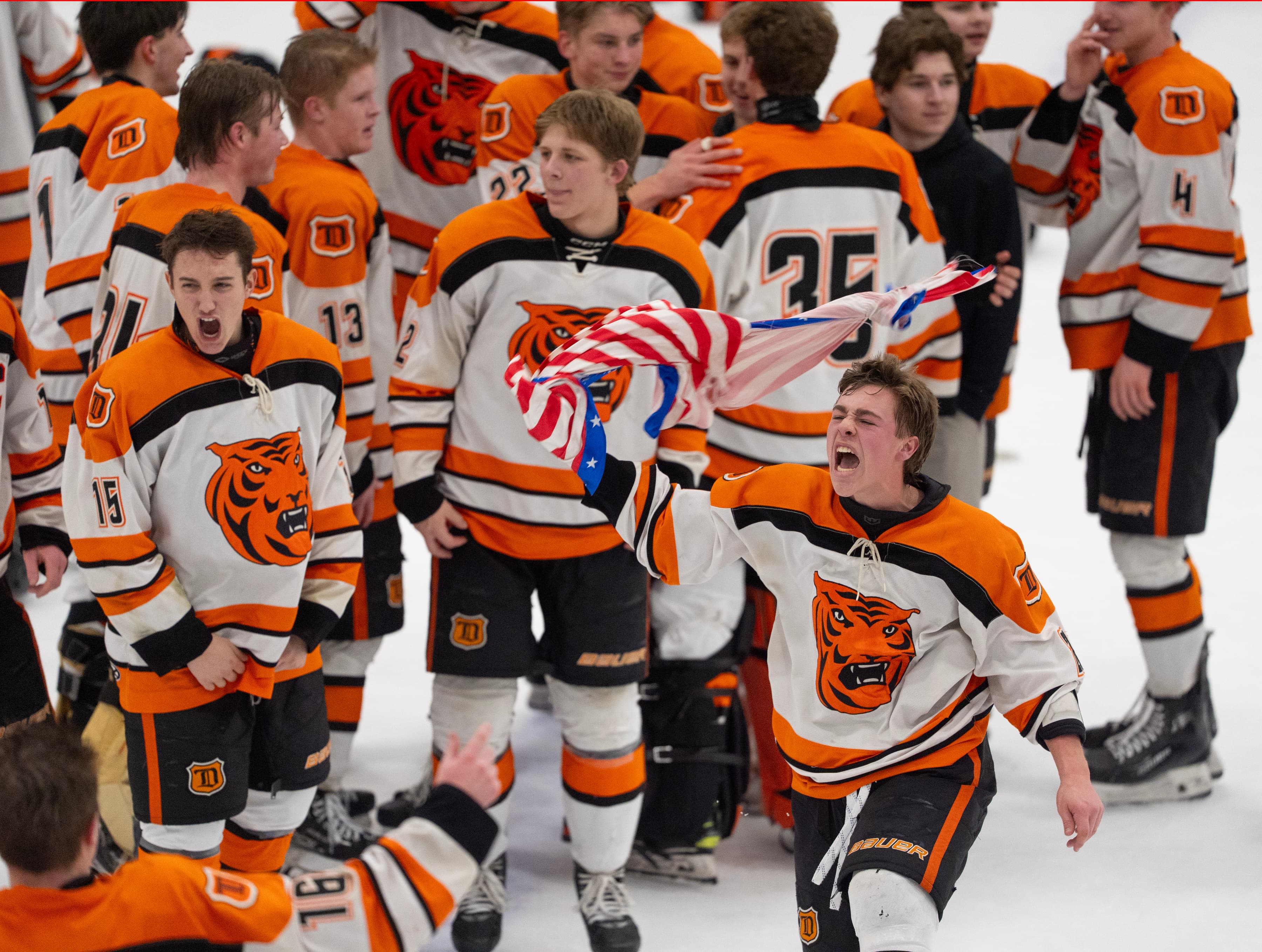 A blur of orange flew across the ice inside the St. Louis Park Rec Center on Thursday, Feb. 26, as Delano hockey players celebrated winning the Class 1A, Section 2 championship with a 6-2 victory over Blake.