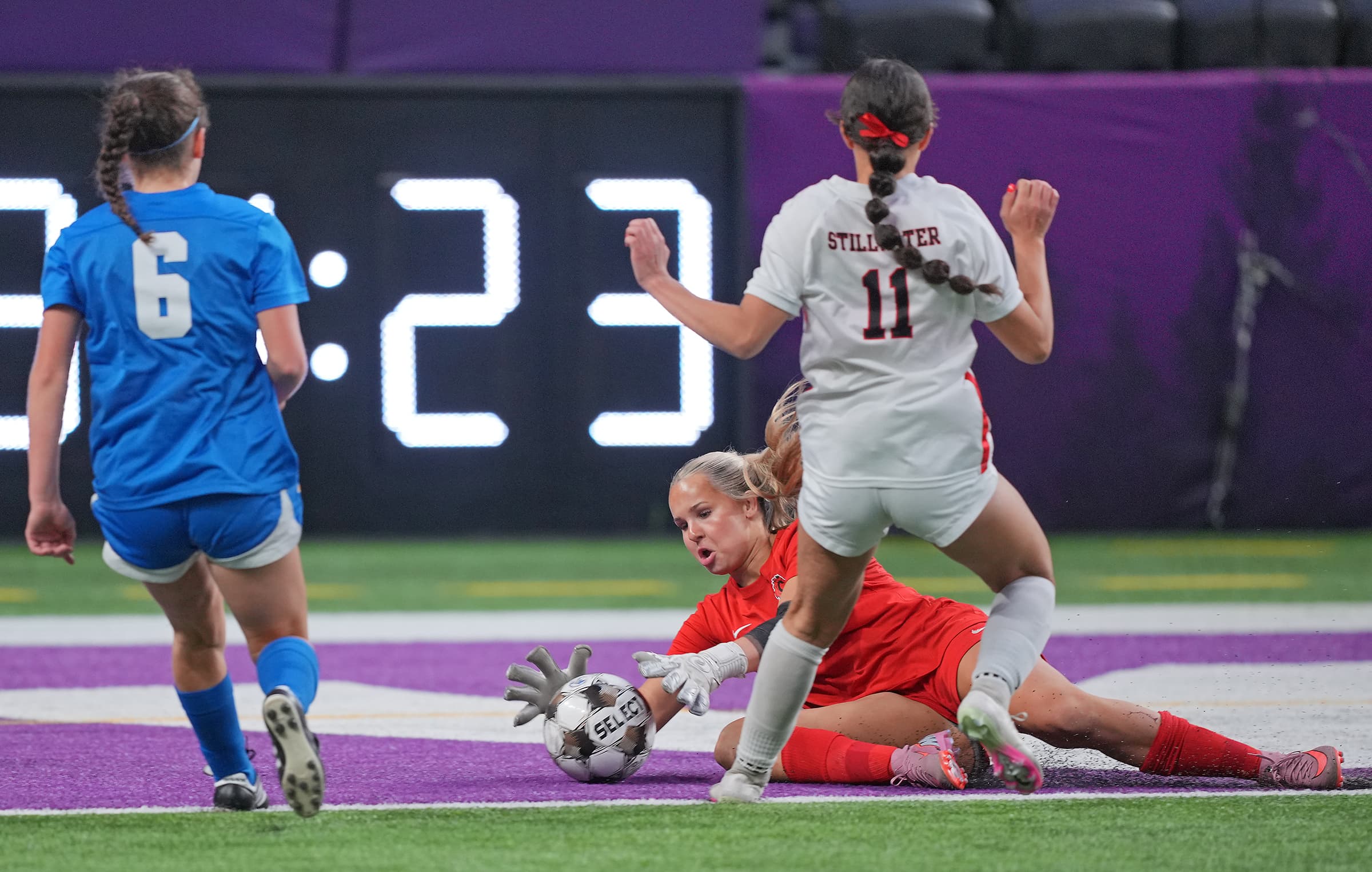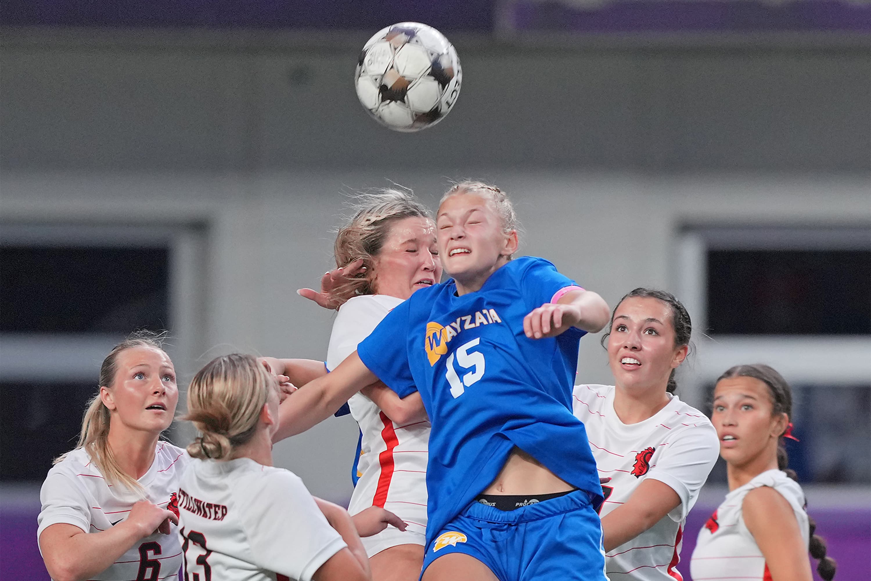 Stillwater clawed one back before halftime, three minutes after Wayzata’s second goal. Muths received a throw-in with her back to goal, and the University of Illinois-Chicago commit’s nice first touch set herself up to turn and curl in a volley.