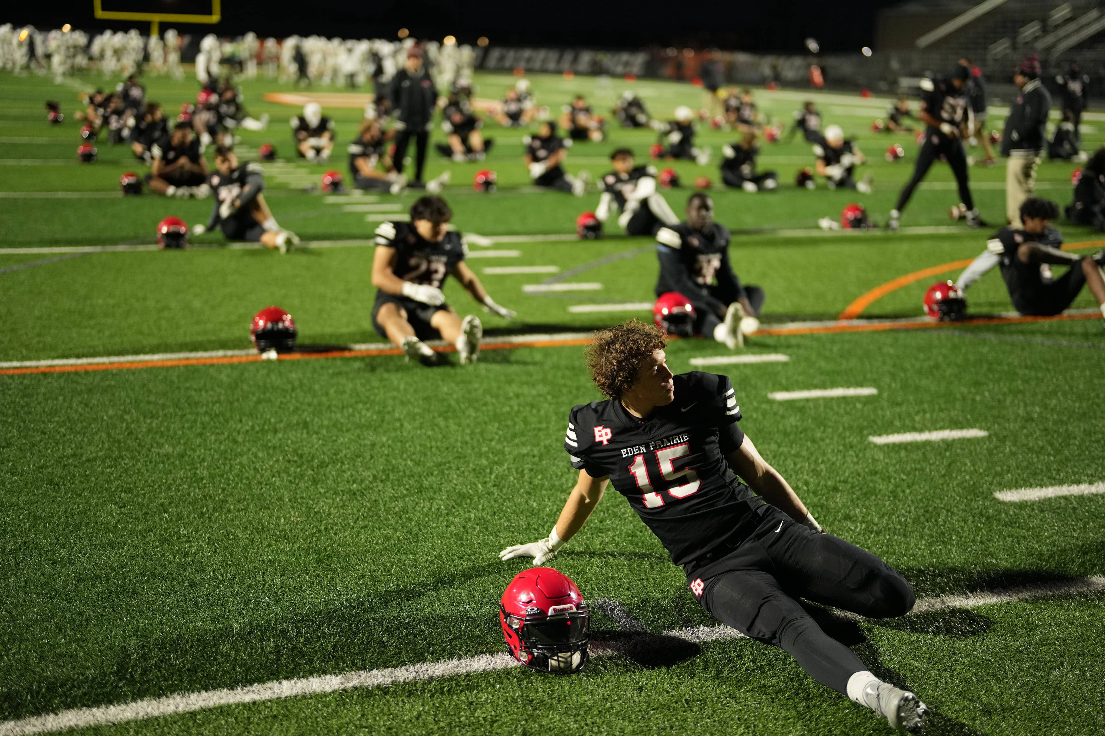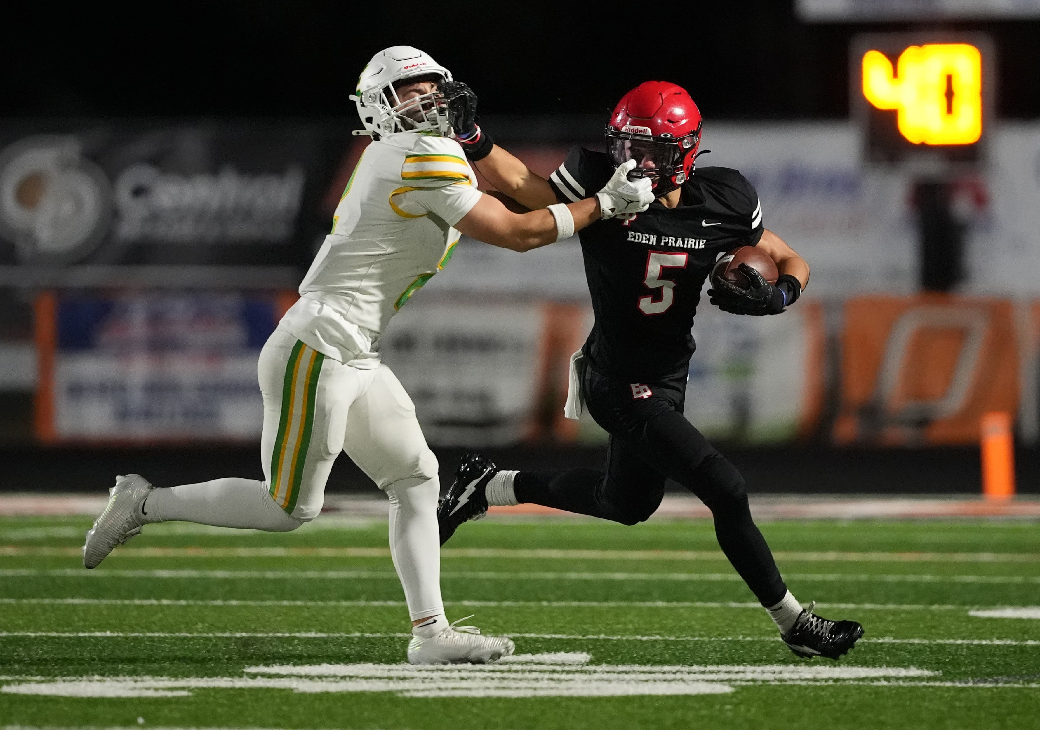 Here at Osseo, we’ve got two of them: No. 3 seed Eden Prairie (8-2) facing No. 4 Edina (6-4). When these teams met Sept. 12, Eden Prairie beat Edina 40-19. The Eagles snagged three interceptions from Edina senior quarterback Mason West — on a quest for Edina’s first state title before he begins his pro hockey journey. Eden Prairie’s rush-heavy offense put up 374 yards on the ground against the Hornets defense.