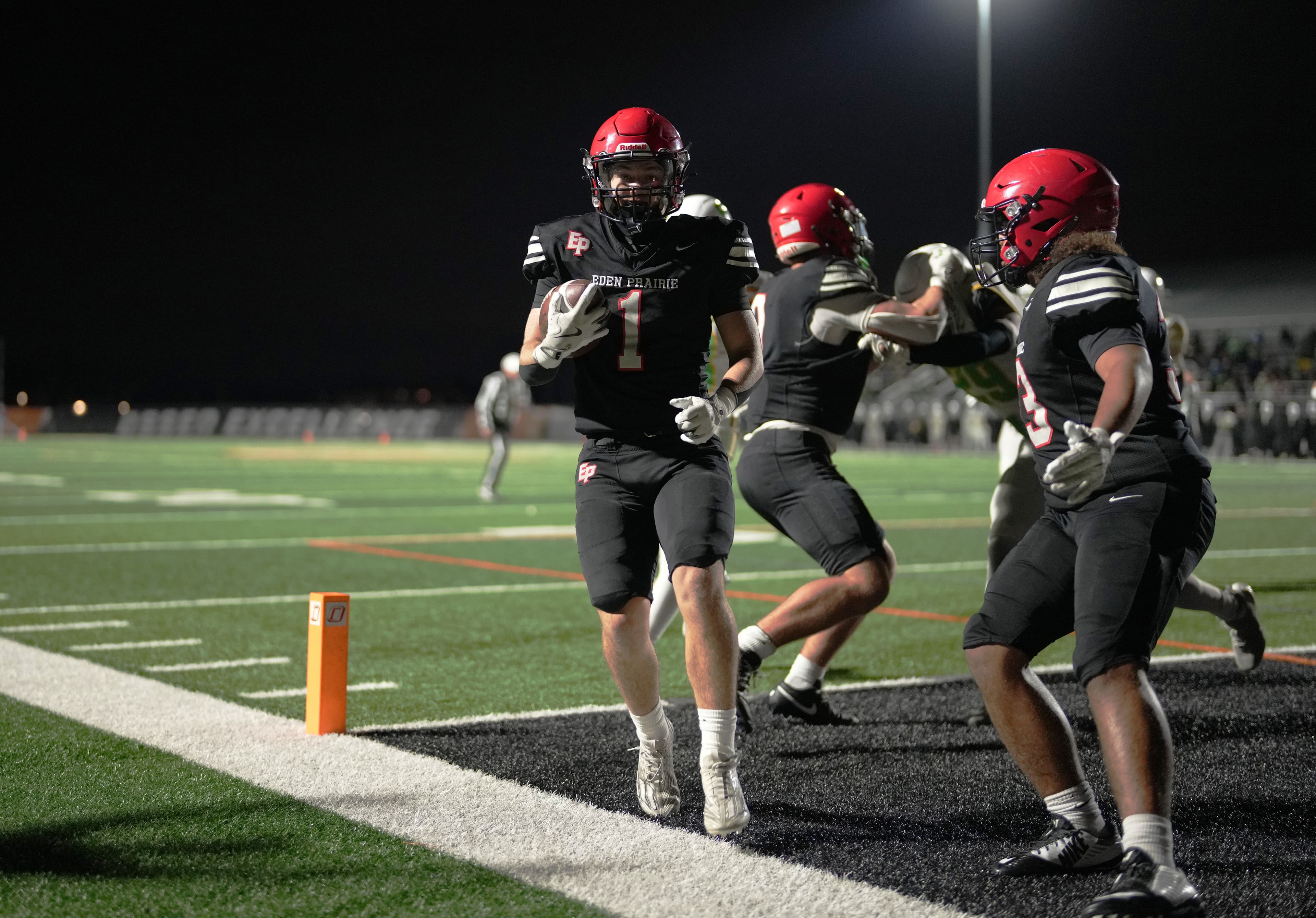 Not very often do you see a drive eat up an entire quarter. But Eden Prairie dragged out an 11-and-a-half-minute drive to open the second half, marched down the field by short rushes from Windlan Hall, Andrew Johnson, Justyce Bates and Owen Konrad. Senior quarterback Jackson Bakkum threw an 11-yard dart out to Hall at the right sideline to set up the Eagles on the Hornets’ doorstep. Bates forced in the 1-yard rushing TD.